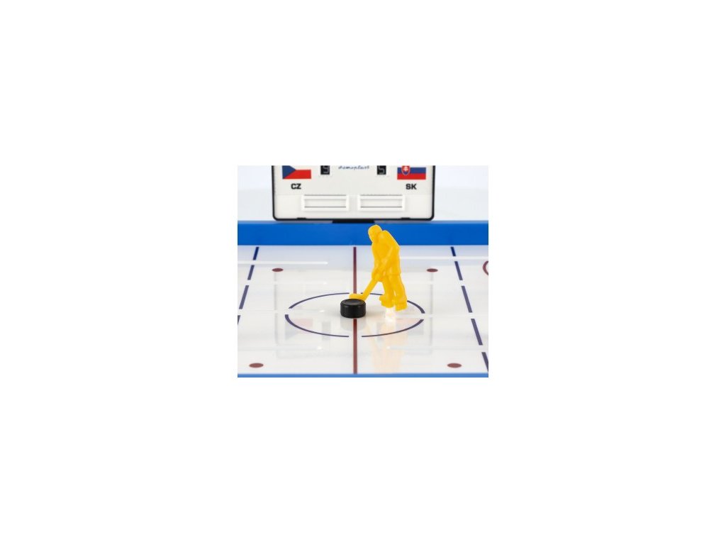 Stolní lední hokej. Obsahuje dva komletní týmy, náhradní hráče, náhradní díly a ukazatel skóre. Rozměry hrací plochy jsou 50x30cm. Hra určená pro dva hráče. Vhodné pro děti od 3 let.