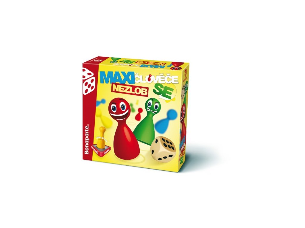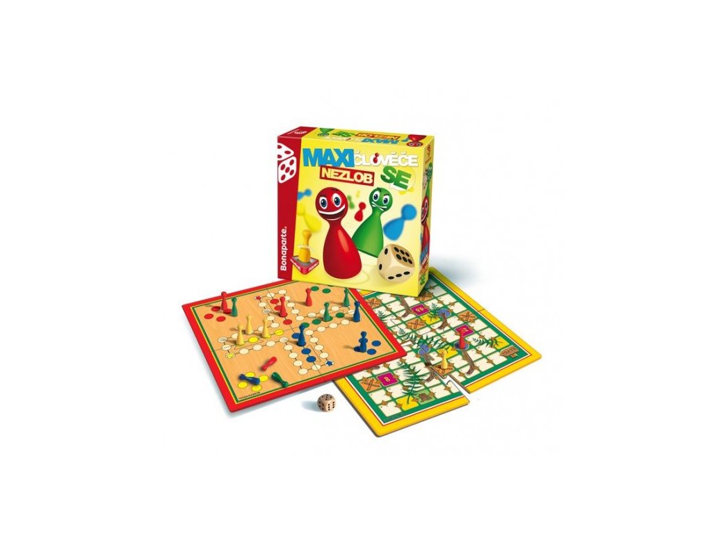 Člověče nezlob se a Lesní závod. Dvě hry v extra velkém provedení, dřevné figurky výška 5 cm, velká dřevěná kosta. Figurky se výborně drží jak těm nejmenším dětem, tak seniorům. Hra obsahuje: oboustranný herní plán, 12 dřevěných figurek, dřevěnou hrací kostku, návod.