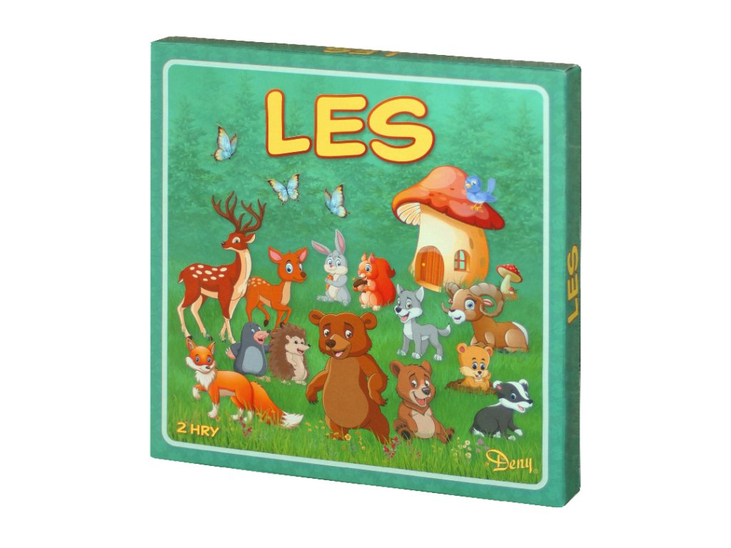 Soubor dvou společenských her - Les a Zvířátka. Obsahuje 40ks obrázkových kartiček, herní plán, kostku a figurku.