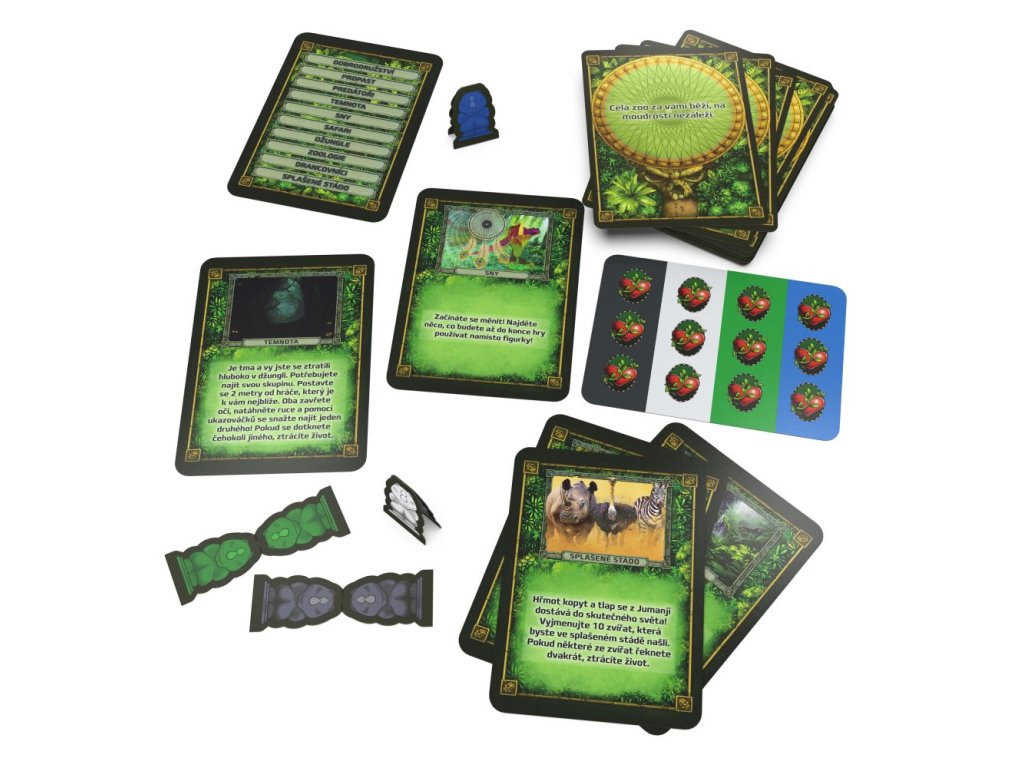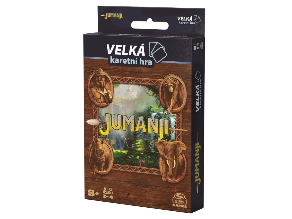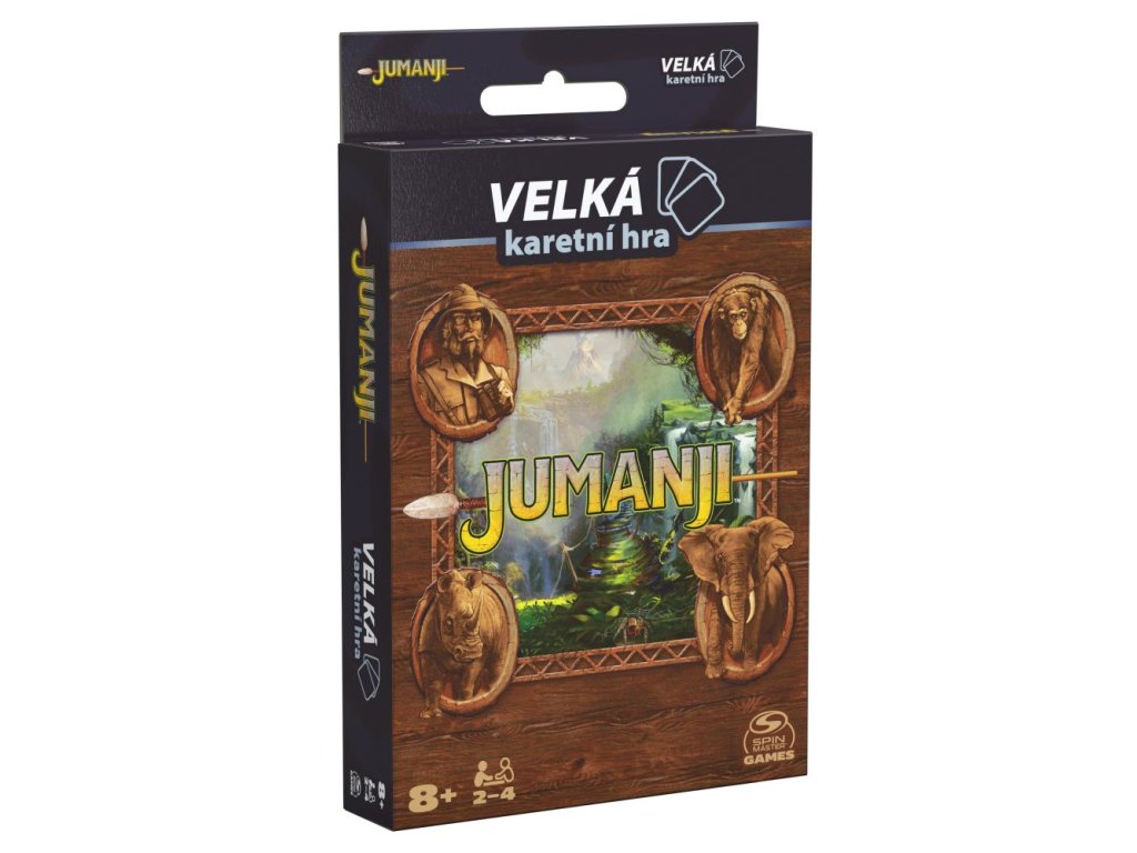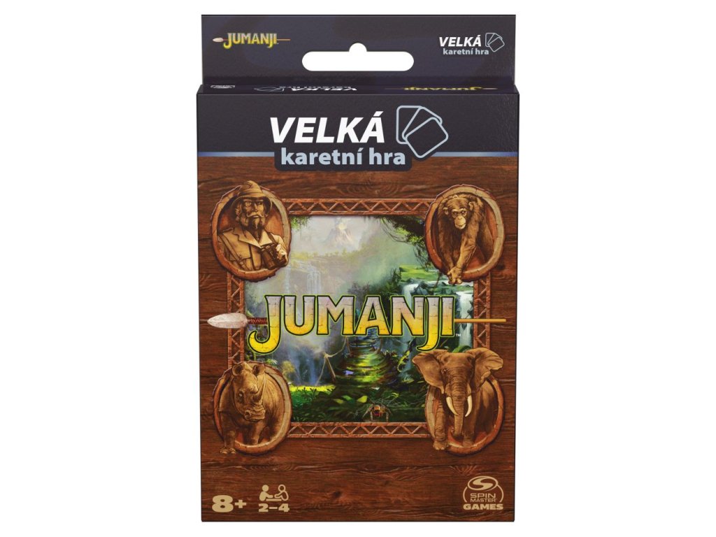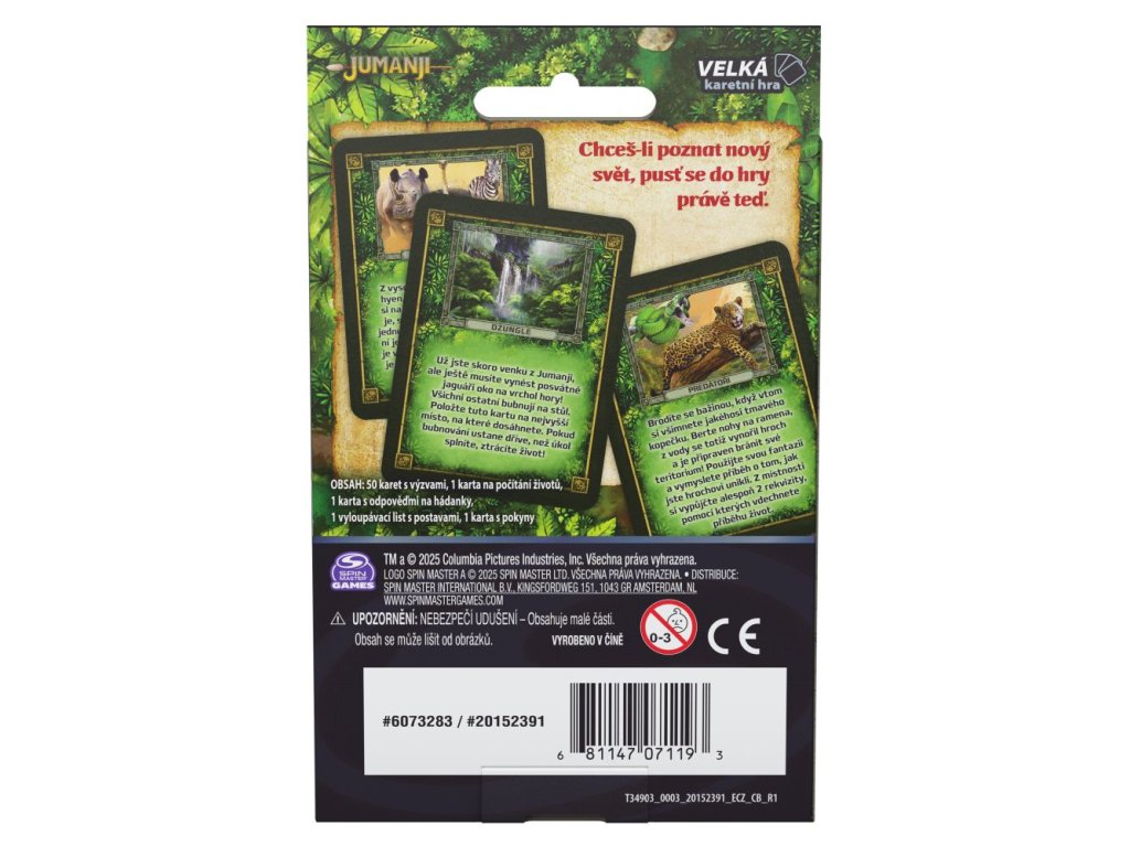 Nezačínejte hrát, pokud nechcete hru dohrát! S karetní hrou Jumanji budete moct se svými kolegy dobrodruhy vyrazit na výpravu džunglí plnou řešení hádanek a plnění výzev, zatímco se všichni budete snažit přežít! Tuto karetní hru je snadné připravit a začít hrát. Vylámejte hrací postavičky, složte je do tvaru stanu a umístěte je na pole pro sledovaní životů na jejich odpovídající barvu. Takto bude mít každý hráč přehled o svých životech. Hra je ideální pro milovníky kultovního filmu Jumanji, ať už dávají přednost tomu s Robinem Williamsem nebo Dwaynem Johnsonem. Položte referenční kartu hádanky lícem nahoru před všechny hráče a výzvu zamíchejte. Dostaňte se přes 10 výzev a ujistěte se, že všichni přežijí! Chceš-li poznat nový svět... pusť se do hry právě teď. Tuto společenskou hru lze hrát jako deskovku pro 2 až 4 hráče. Na věku nezáleží – s touto párty deskovkou se určitě při rodinném večeru pobaví dospělí, teenageři i děti ve věku 8 a více let! Klasický akční film Jumanji má tu nejlepší hru pro dospělé i pro děti. Je to skvělá hra na cesty, ale poslouží i jako žertovný dárek nebo dárek k narozeninám. Nebojte se... zahrát si karetní verzi Jumanji!