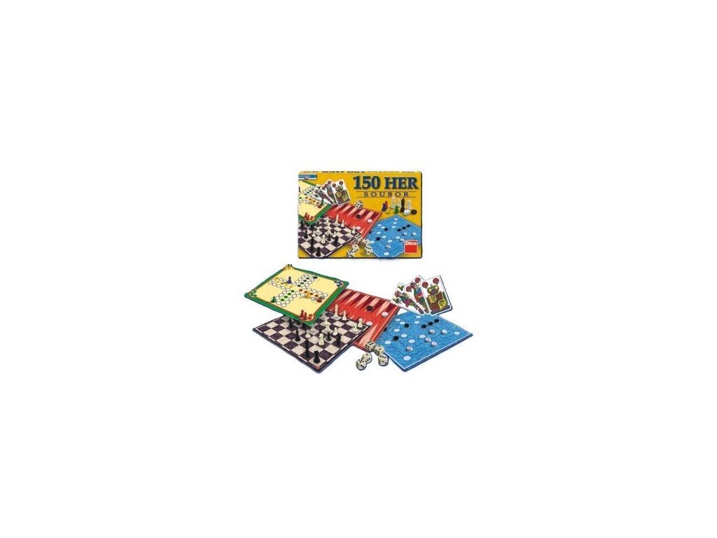 Soubor 150 her. Balení obsahuje 2 herní oboustranné plány, 32 šachových figurek ve 2 barvách, 16 figurek ve 4 barvách, 30 dámových kamenů ve 2 barvách, 6 bodových hracích kostek, 32 jednohlavých mariášových karet, 1 pravidla. Hra je určena pro 2 a více hráčů. Vhodné od 6 let.