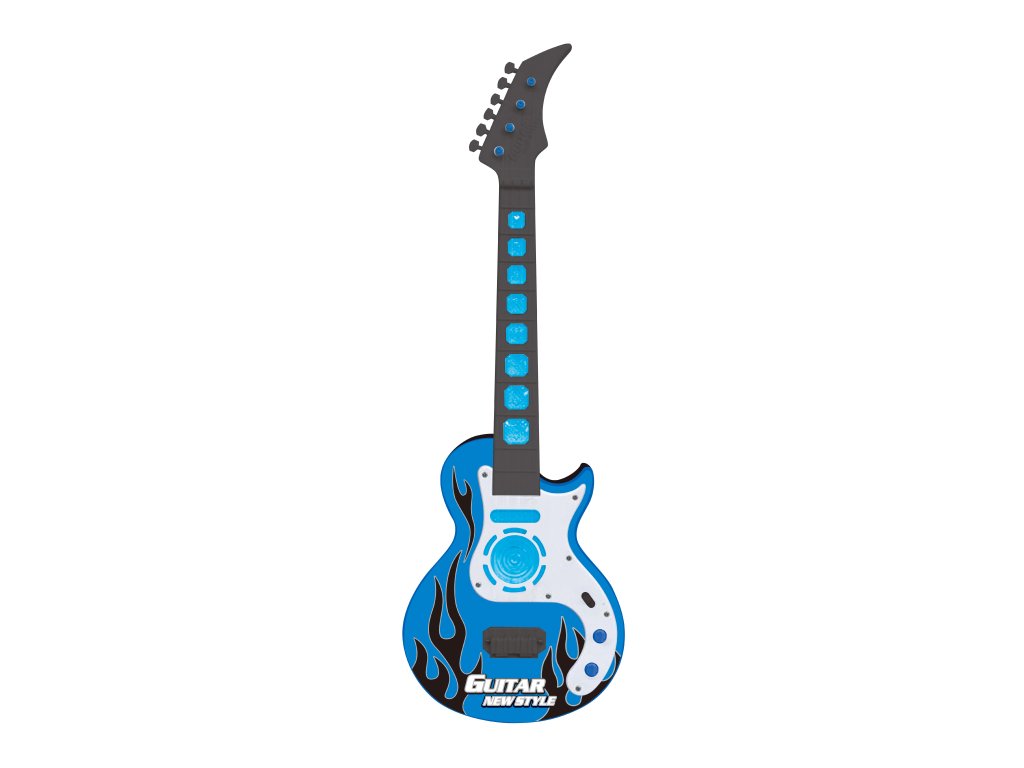Elektrická kytara. Rozměry 18x5,5x54 cm. Světelné a zvukové efekty. 3xAA baterie nejsou součástí. Přepínač ON/OFF vedle potenciometrů. Oba potenciometry světelné a zvukové efekty.