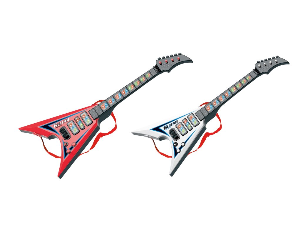 Elektrická kytara. Rozměry 22x5x56 cm. Světelné a zvukové efekty. 3xAA baterie nejsou součástí. Přepínač ON/OFF vedle potenciometrů. Oba potenciometry světelné a zvukové efekty.