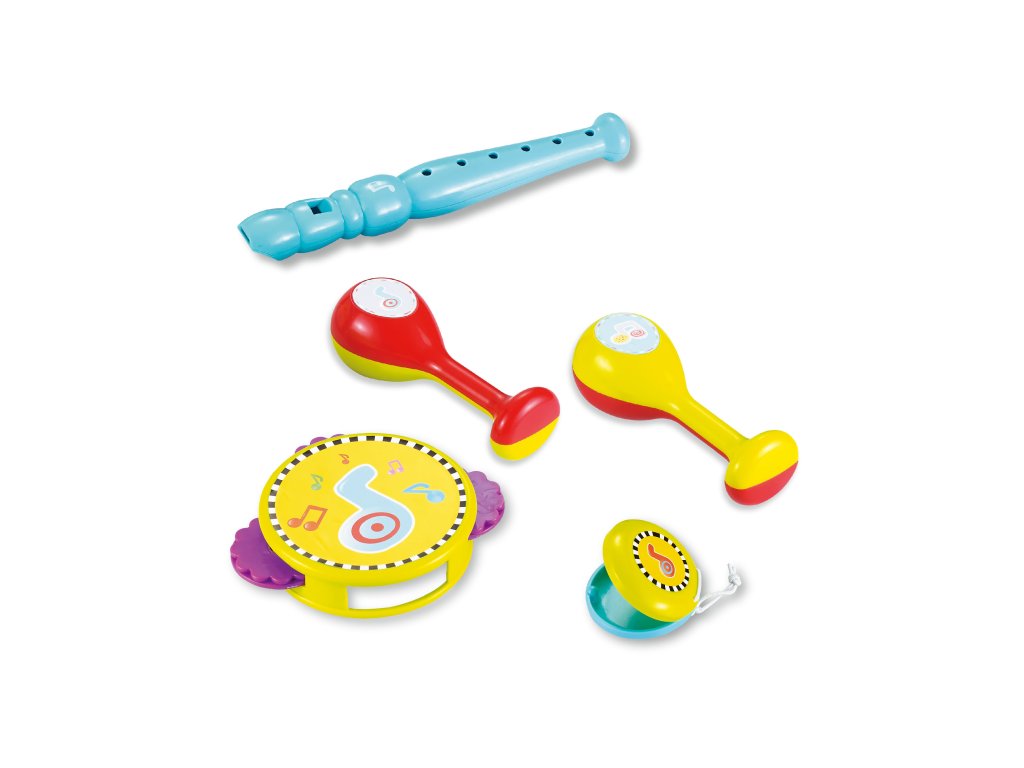 Hudební nástoje. 5ks. 2 varianty. 1 varianta obsahuje: rumba koule, foukací harmoniku, flétnu a tamburínu. 2.varianta obsahuje: rumba koule, kastaněty, flétnu a tamburínu