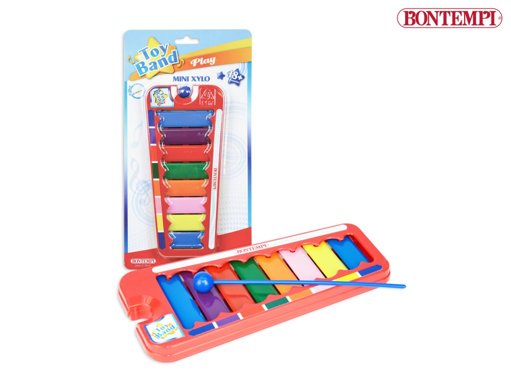 Pestrobarevný xylofon, který obsahuje 1 paličku a vydává 7 tónů.