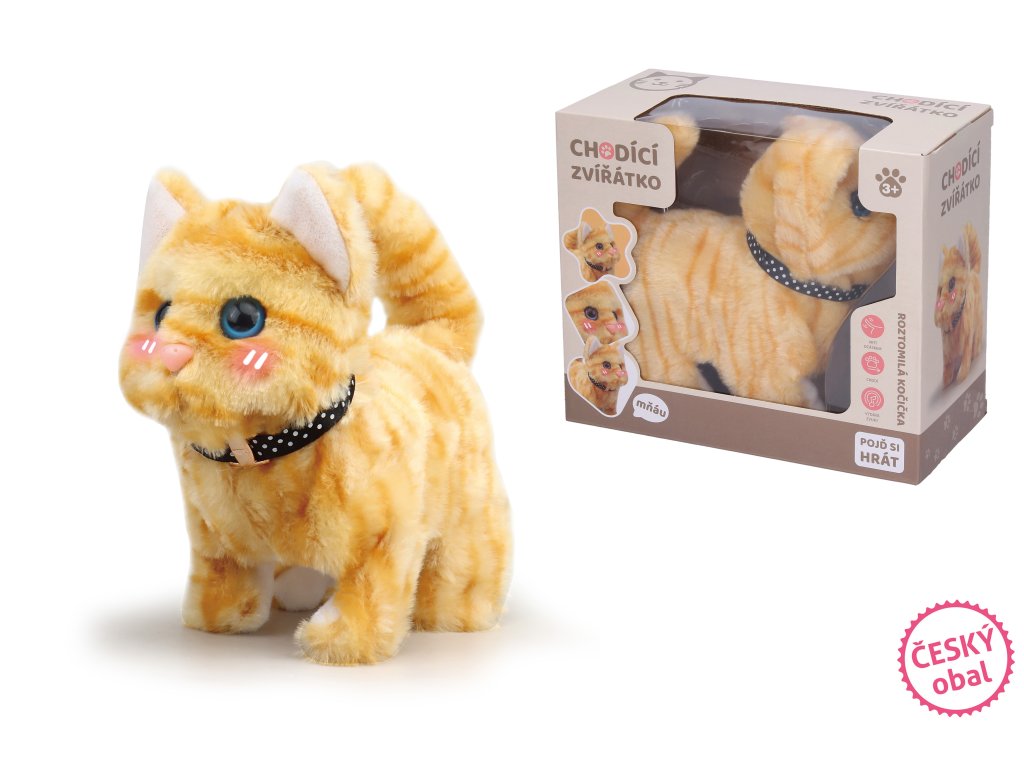 Kočka chodící. Rozměry: 9x16.5x16cm. Kočka chodí, červená se, vrtí ocáskem. světelné a zvukové efekty. Baterie 2xAA nejsou součástí. Vypínač on/off