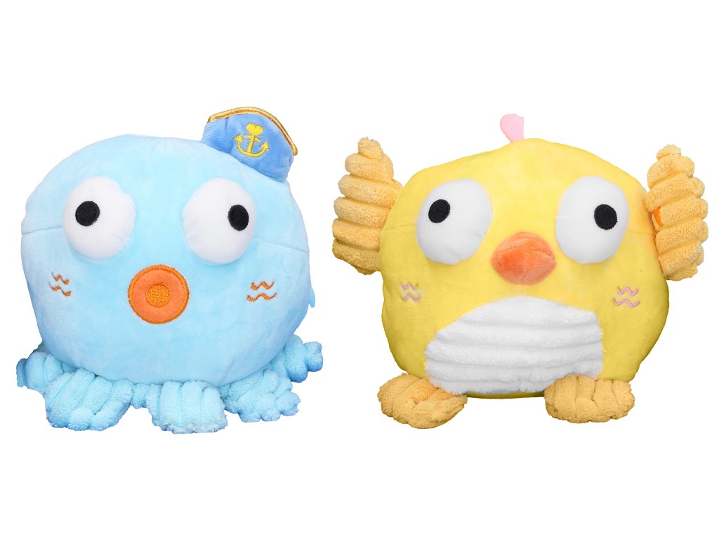 Opakovací zvířátko. Velikost 15cm. Stisknutím klepítka(krab), korunky(červená chobotnice), křídla(kuře) nebo čepice(modrá chobotnice) se spouští nahrávání a zvířátko rovnou opakuje co slyší. Dalším stiknutím se zapnou písničky, dalším opět nahrávání atd. Vypíná se on/off přepínačem uvnitř zvířátka. Zezadu má zip. 3xAAA baterie nejsou součástí. 4 varianty -krab, kuře, modrá chobotnice, červená chobotnice
