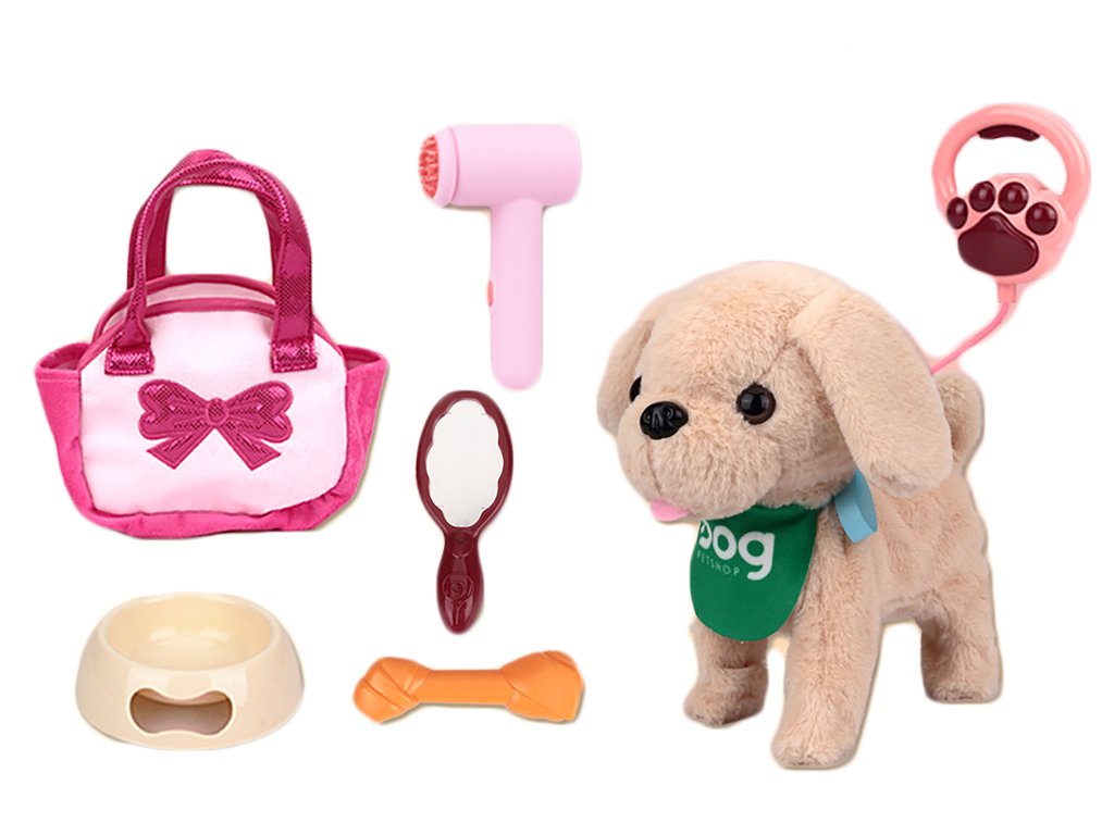 Pes chodící na vodítku s funkcemi. Kabelové ovládání. Velikost 25 cm. Zvukové efekty. Dotyk psa - chodí, vrtí ocasem, štěká. Zatleskání - vrtí ocasem, naříká, opětovný potlesk - chodí, vrtí ocasem, štěká. Tlačítko na levém boku psa - hudba, chůze, vrtění ocasem, opětovný stisk - hudba, chůze, vrtění ocasem. Držení tlačítka - opakuje co říkám, ukončení dotykem hlavy. Vodítko - stisk tlačítka - hudba, chůze, vrtění ocasem, opětovný tisk změna hudby. 3xAA baterie do psa ze spodní strany nejsou součástí. Přepínač ON/OFF na spodní straně psa. Sundavací plyšový potah psa k vyčištění. Součástí miska, kost, kartáč, fén, taška.