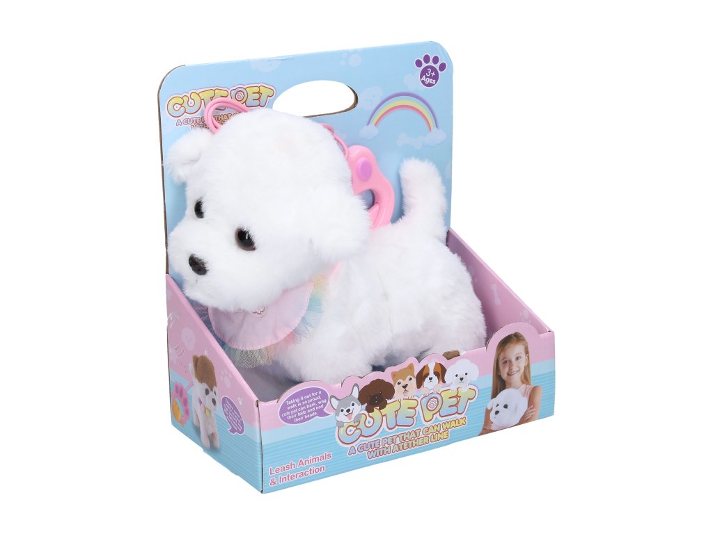 Pes chodící s efekty na kabel. Velikost 22 cm. Kabel s ovladačem se připojuje do otvoru na krku. Chůze, štěkání, vrtění ocasem, pohyb hlavy. Stiskem vodítka (ovladače) - chůze. Dotykem hlavy - efekty. Zatleskání - chůze. 3xAA baterie nejsou součástí. Přepínač ON/OFF na bateriové krabičce na spodní straně psa pod suchým zipem.