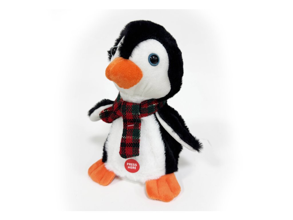 Tučňák opakuje co říkáš. Zvukové efekty, opakuje, tančí a zpívá. Rozměry 13x11x19 cm. Tlačítko na bříšku. 3xAAA baterie, součástí balení. Přepínač, OFF/TRY ME/PLAY.