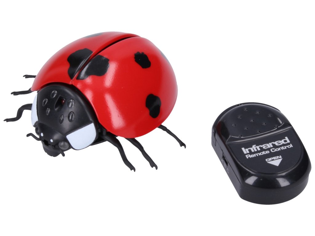 Obří beruška na dálkové ovládání. Velikost 9 x 9 cm. IR ovladač, dopředu, couvání doprava, demo. Výdrž až 20 min, dosah 10 m. Beruška 3 x LR44 součástí, ovladač - 3xLR44, součástí. Věk: 6+