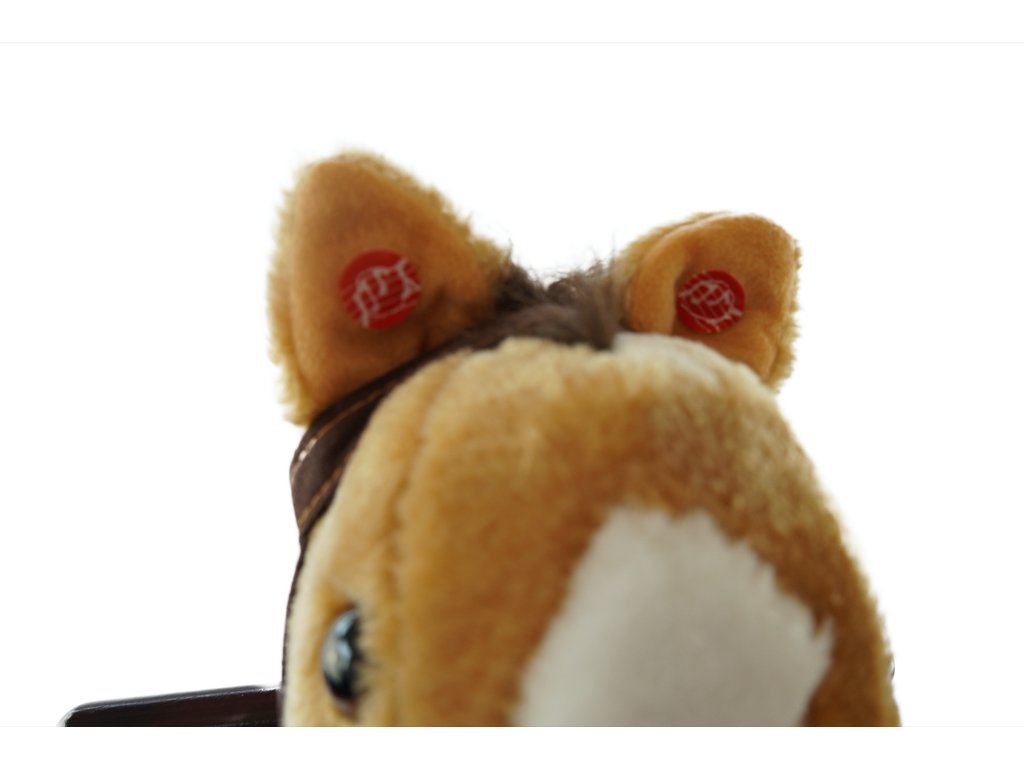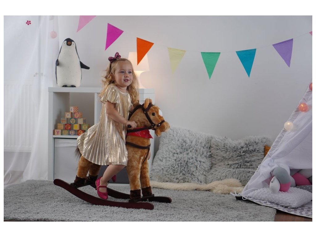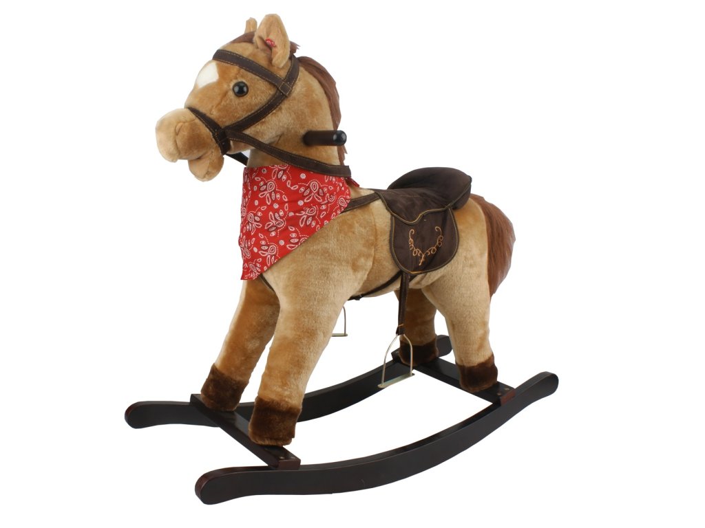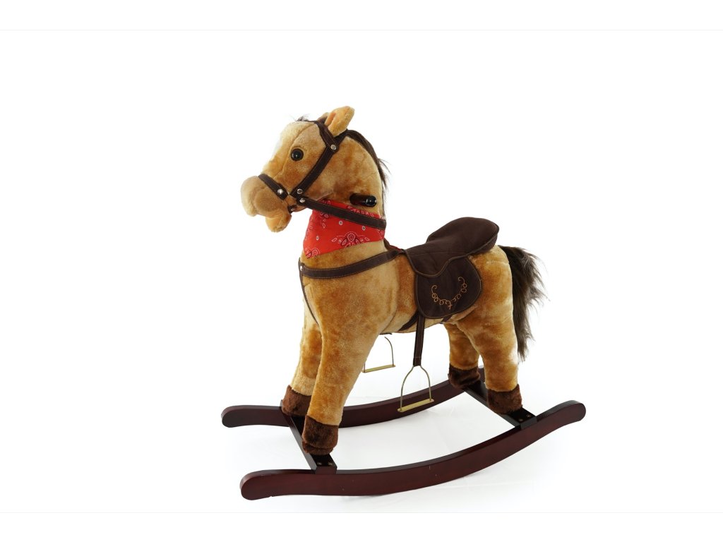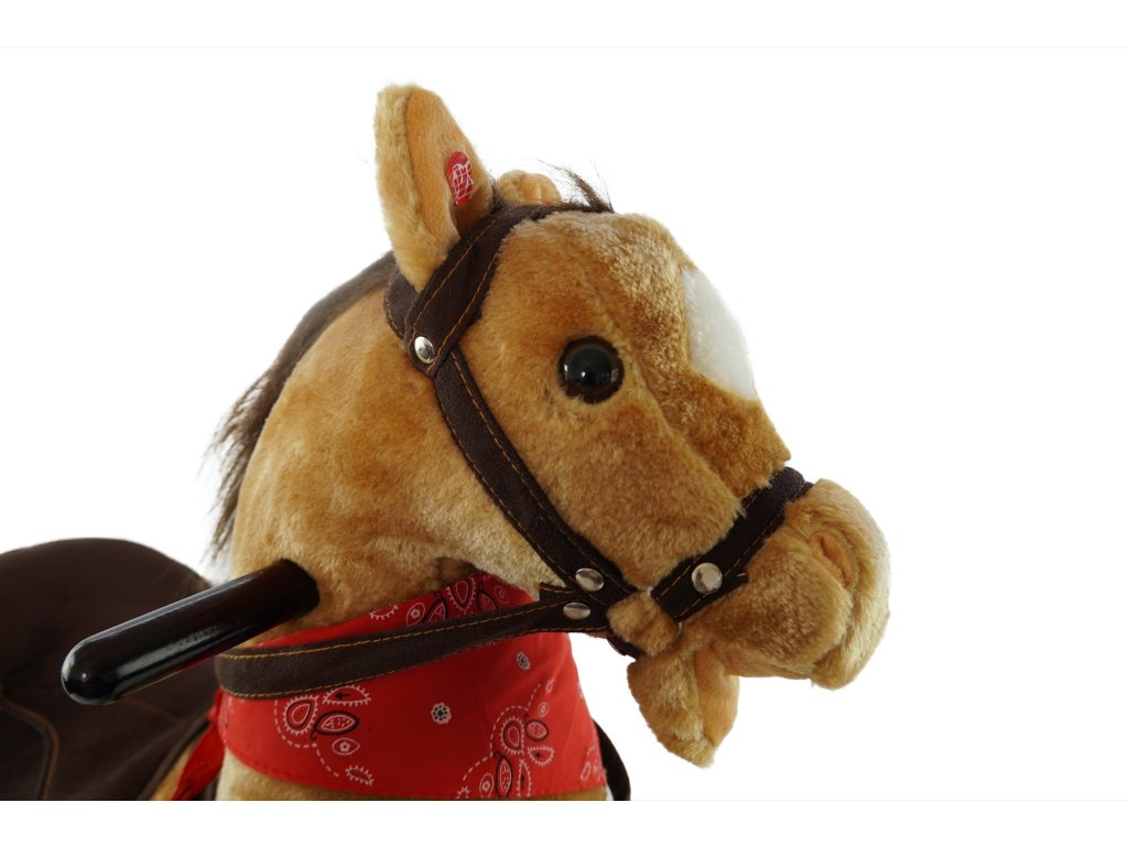 Hnědý houpací koník, který vydává zvuky při stlačení jednoho nebo druhého ouška. Řehtá a kluše. Na krku má moderní šátek. Koník je vyroben z kvalitní a hebké plyše. Nosnost 30 kg.