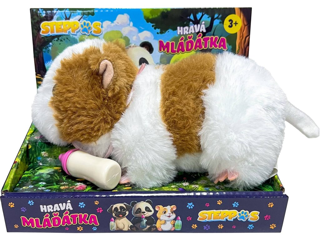 Přiložte láhev s mlékem k tlamě, ozve se zvuk pití. Vyjměte láhev s mlékem, ozve se roztomilý zvuk.