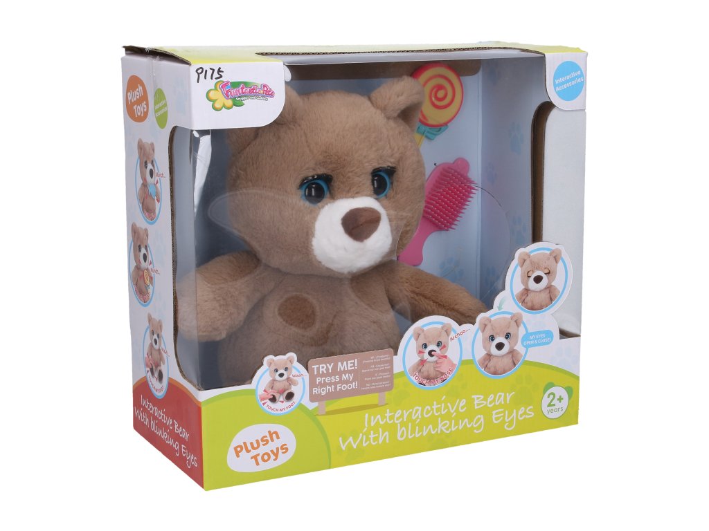 Medvěd interaktivní set. Velikost v sedu 27 cm. Zvukové efekty a mrkání stlačením levé ruky a přiložením předmětů nebo dotykem (stiskem) jiné části těla - hlavy, čumáku (kýchání), hrudi (smích). 3x rychlý dotek hlavy - zavře oči a spí. Přiložení lízátka a rybky k tlamičce - papání. 3xAA baterie součástí. Přepínač on/off/try me v zadní části hlavy. Součástí hřeben na česání.