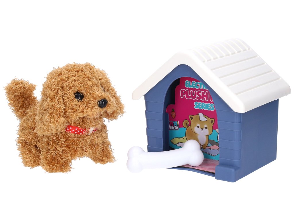 Pejsek s boudou. Velikost pejska 15cm. Velikost boudy 16cm. Obsahuje boudu, pejska, kost. 2xAA baterie nejsou součástí.