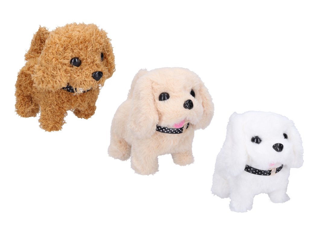 Pes chodící se zvukovými efekty. Rozměry 16x9x12 cm. Display box - 8 ks. 3 varianty - bílý, hnědý, žlutý. Chodí, hýbá ocasem a štěká. ON/OFF přepínač na spodní straně. 2xAA baterie nejsou součástí.