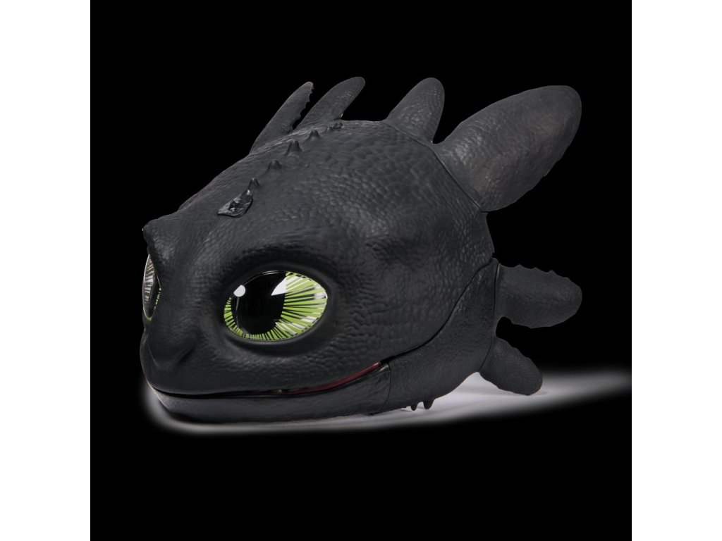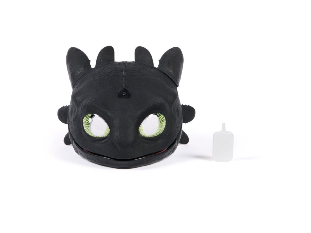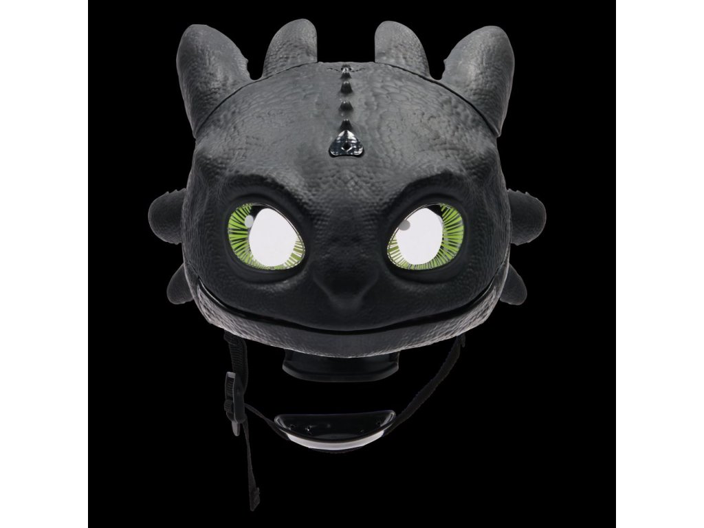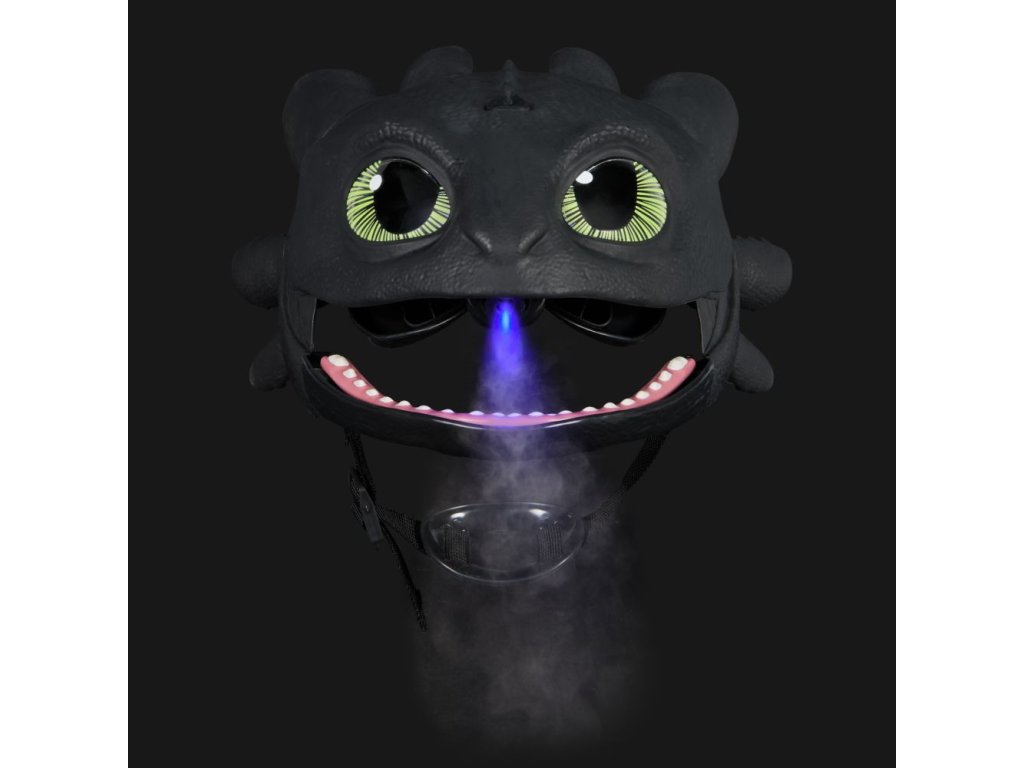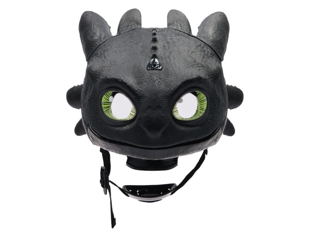 Interaktivní maska Bezzubky. Po nasazení na hlavu upevníte pásek kolem brady. Následně pak otvíráním vašich úst aktivujete zvukové a světekné efekty. Maska dokonce umí chrlit páru imitující kouř z dračí tlamy.