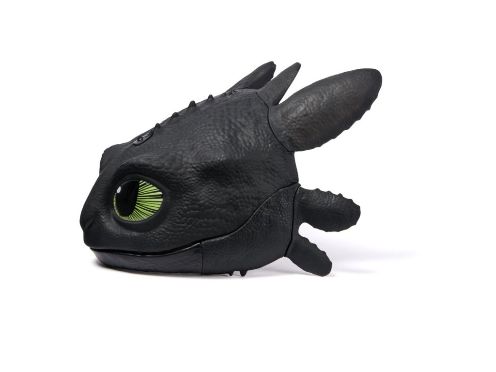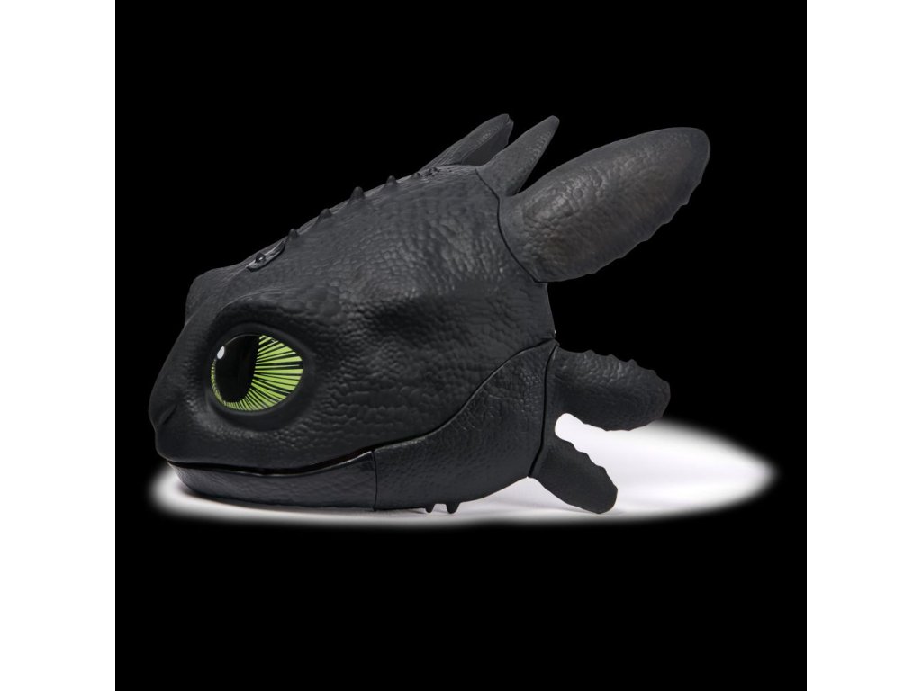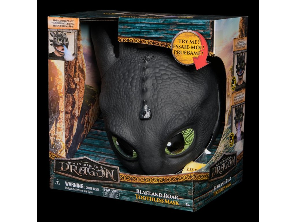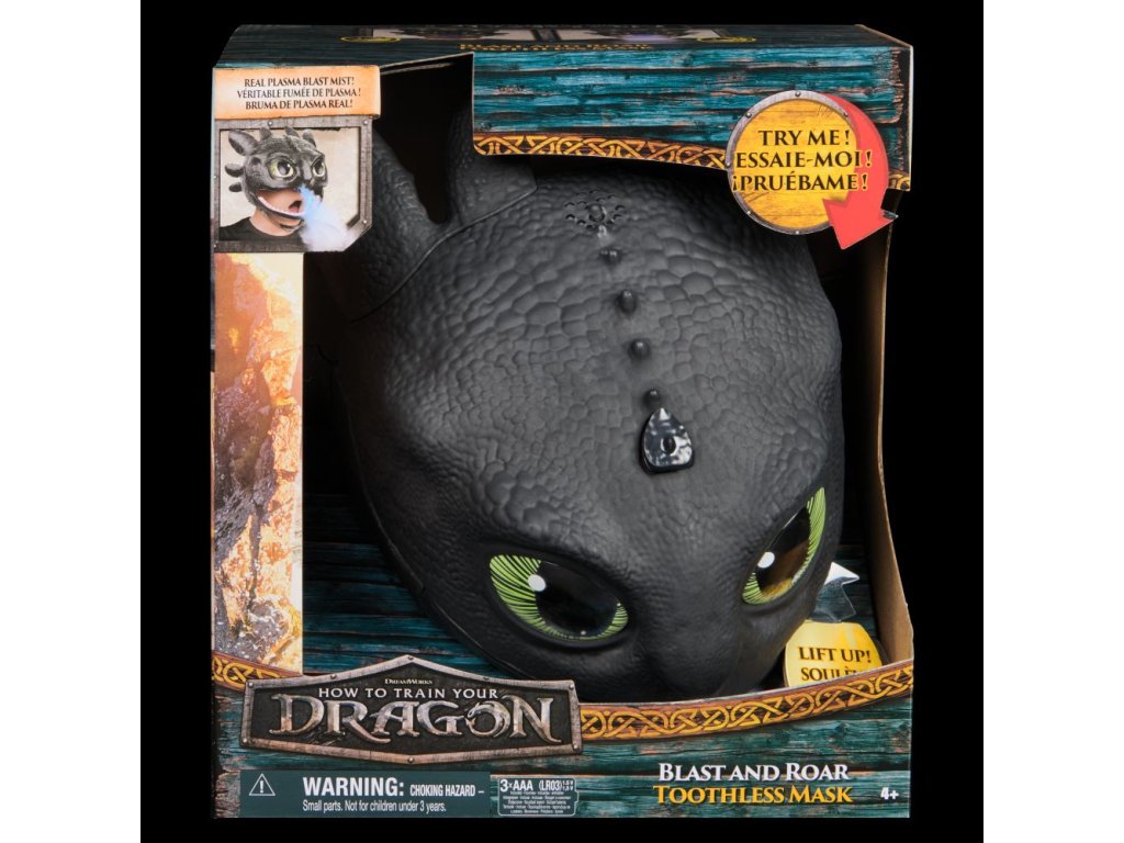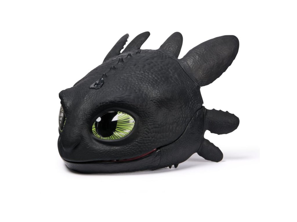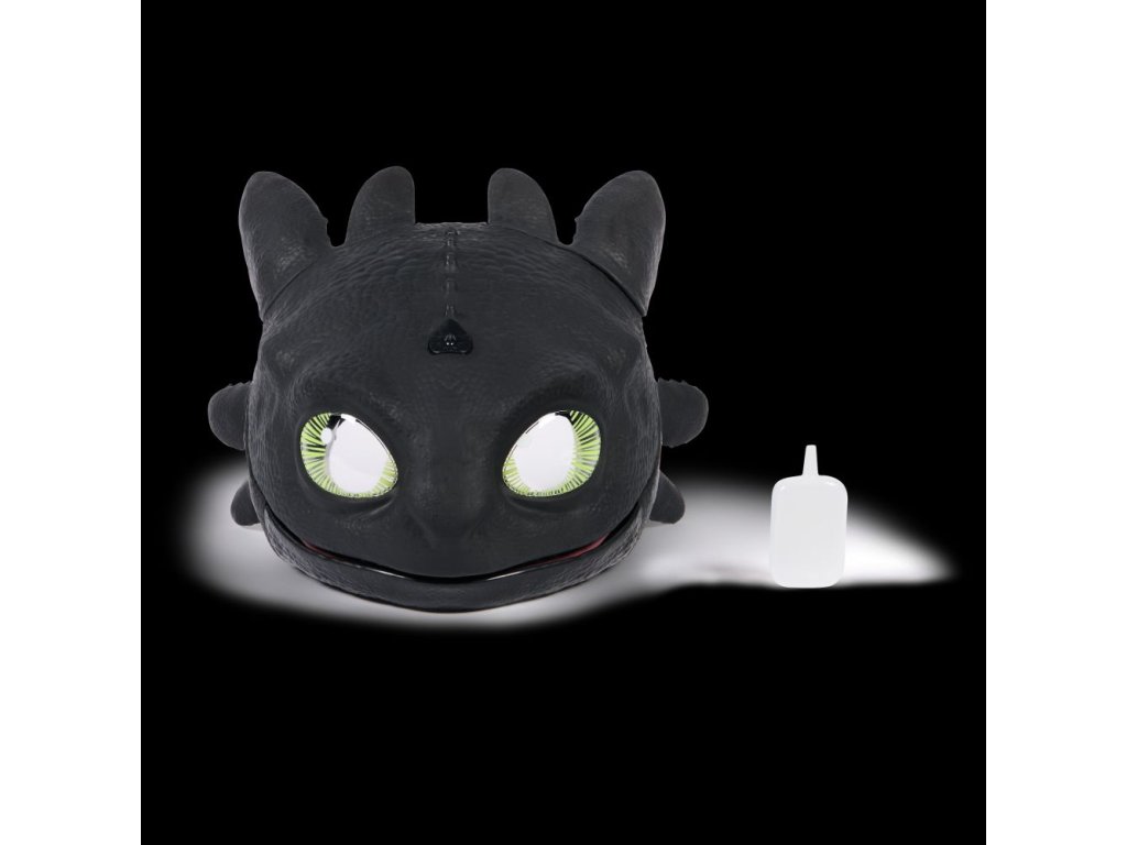 Interaktivní maska Bezzubky. Po nasazení na hlavu upevníte pásek kolem brady. Následně pak otvíráním vašich úst aktivujete zvukové a světekné efekty. Maska dokonce umí chrlit páru imitující kouř z dračí tlamy.