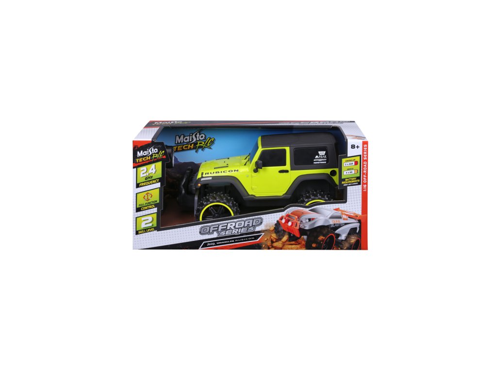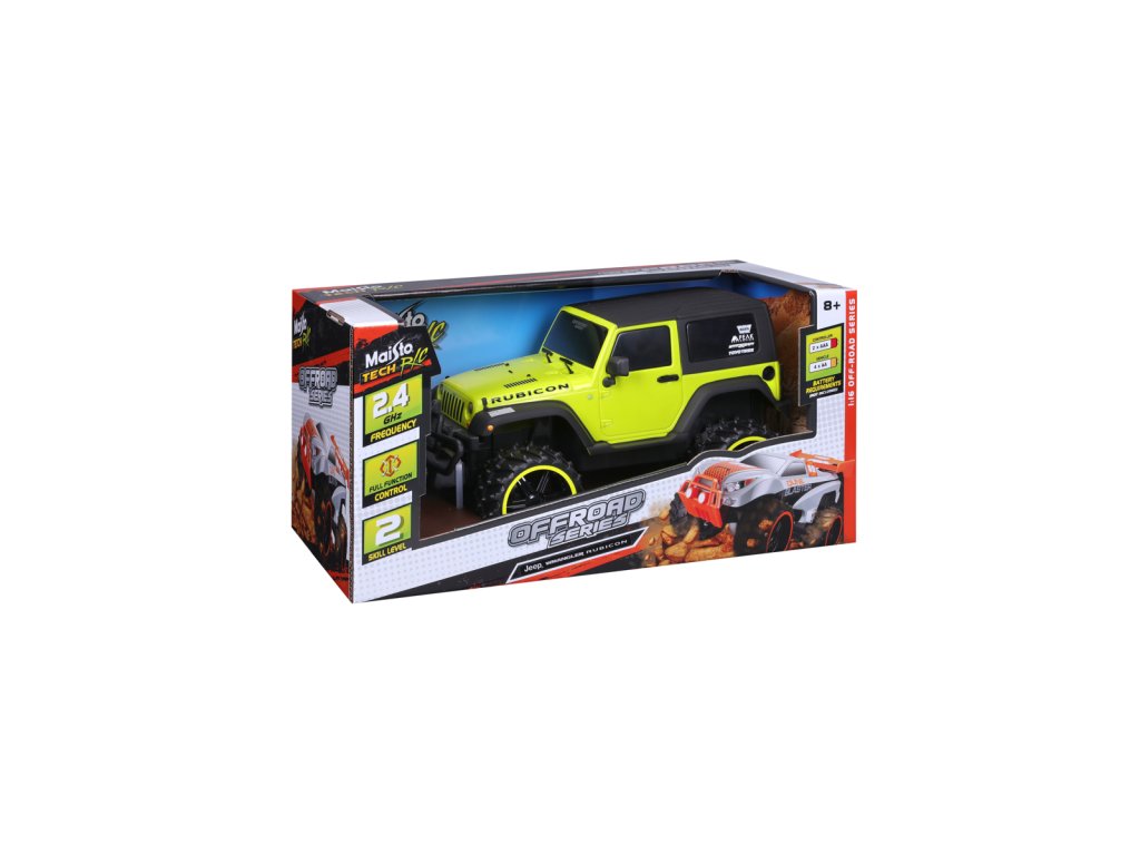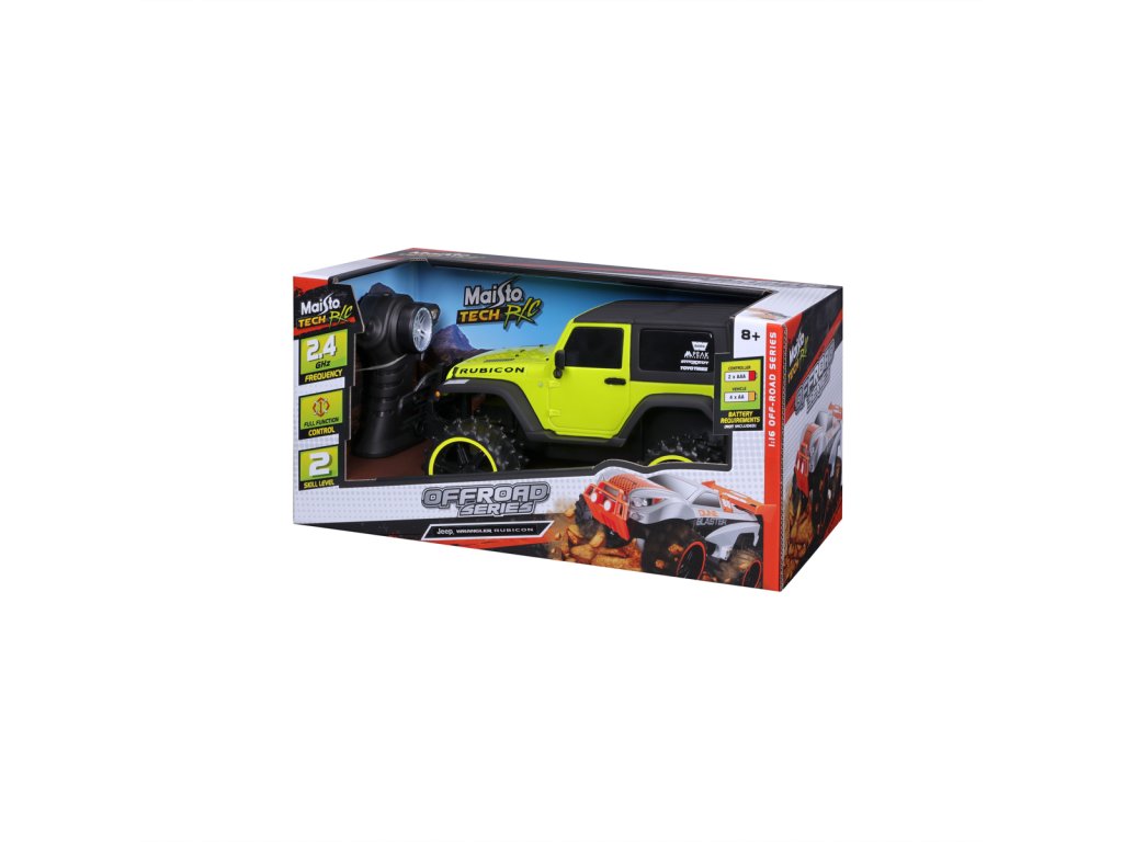 Jeep Wrangler Rubicon v měřítku 1:16, žlutá barva. Model na dálkové ovládání od značky Maisto. Terénní auto s velkými pneumatikami pro skvělý zážitek z jízdy. Auto funguje na 4x AA baterie (nejsou součástí). Ovladač má dosah až 35 metrů a používá 2x AAA baterie (nejsou součástí). Rozměr balení: 39,4x19,1x19,1 cm. Věk 8+