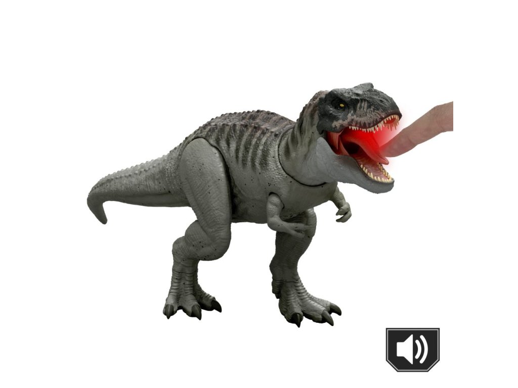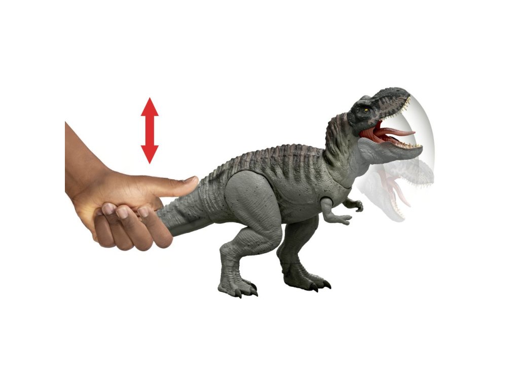 Tento Tyrannosaurus rex inspirovaný filmem přináší ultimátní bojovou akci s nepřetržitým kousáním, světly a děsivým řevem. Stisknutím jazyka jednou T-Rex zařve, ale pokud jazyk podržíte prstem nebo figurkou jiného dinosaura, spustí se divoké sekvence kousání, zvuků a světelných efektů. Pohybem ocasu aktivujete útok z různých směrů! Tento 53 cm dlouhý masožravec potěší všechny malé milovníky dinosaurů od 4 let. Naskenujte kód na noze v aplikaci Jurassic World Play a přidejte si T-Rexe do své digitální sbírky!