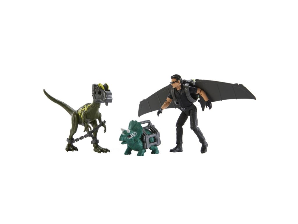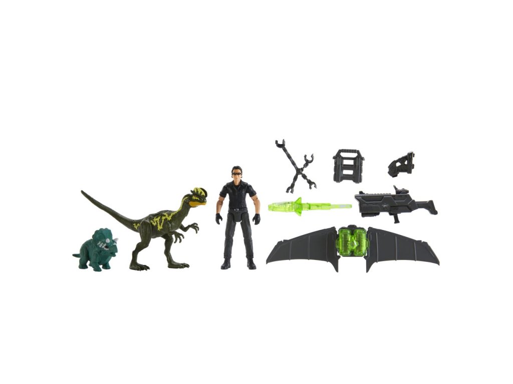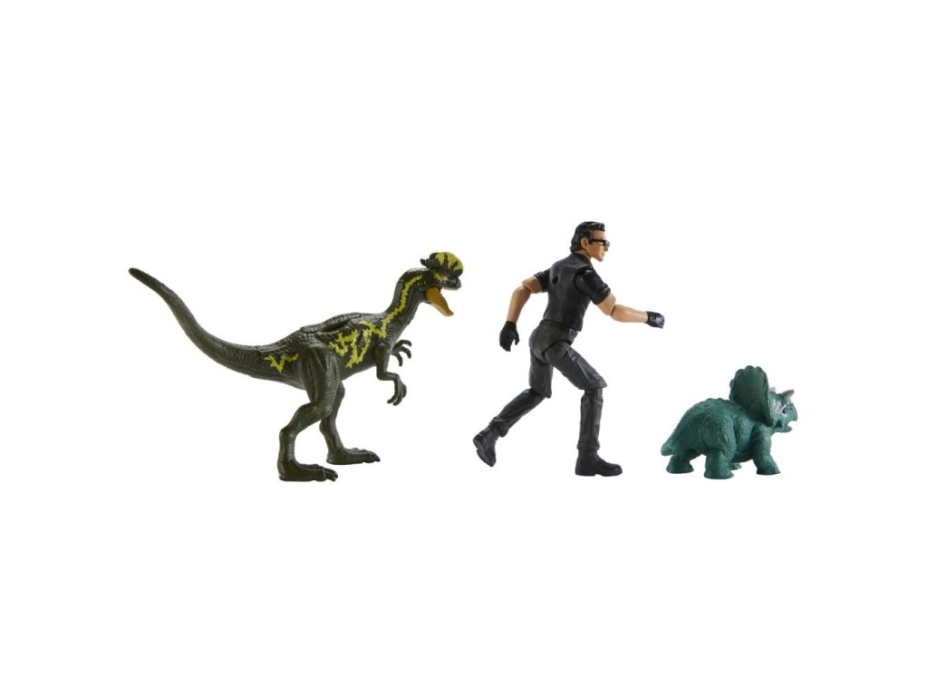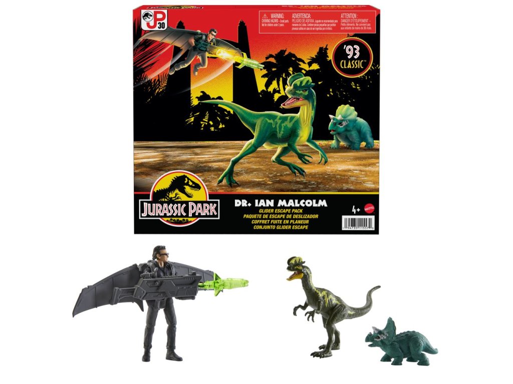 Tento původní nostalgický set Jurský svět Ian Malcolm s dinosaury a doplňky obsahuje polohovatelnou figurku Iana Malcolma s odnímatelným taktickým kluzákem InGen s 22 cm širokými křídly. Dilophosaurus má DNA tag pro rozšířené digitální hraní a je dodáván s odnímatelným záchytným zařízením pro hlavu a nohu. Dětský Triceratops se dodává s odnímatelným odchytovým postrojem. Mezi další příslušenství patří odpalovač uspávacích látek a kryo-obal embryí.