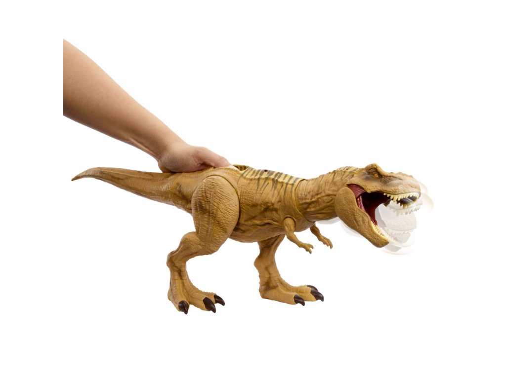 Tato figurka dinosaura T-Rex na lovu se zvuky z filmu Jurský svět má novou útočnou funkci. Po stisknutí tlačítka T-Rex otevře tlamu a otočí hlavu na stranu za doprovodu dinosauřího řevu. Figurka o rozměrech přibližně 48 cm na délku a 17 cm na výšku a v provedení pouštního biomu je vybavena sportovním odnímatelným sledovacím zařízením, které umožňuje lépe vidět v terénu. Rozšířená digitální hra je dostupná naskenováním skrytého DNA tagu ve vylepšené aplikaci Jurassic World Facts. Barvy a vzhled výrobku se mohou lišit.