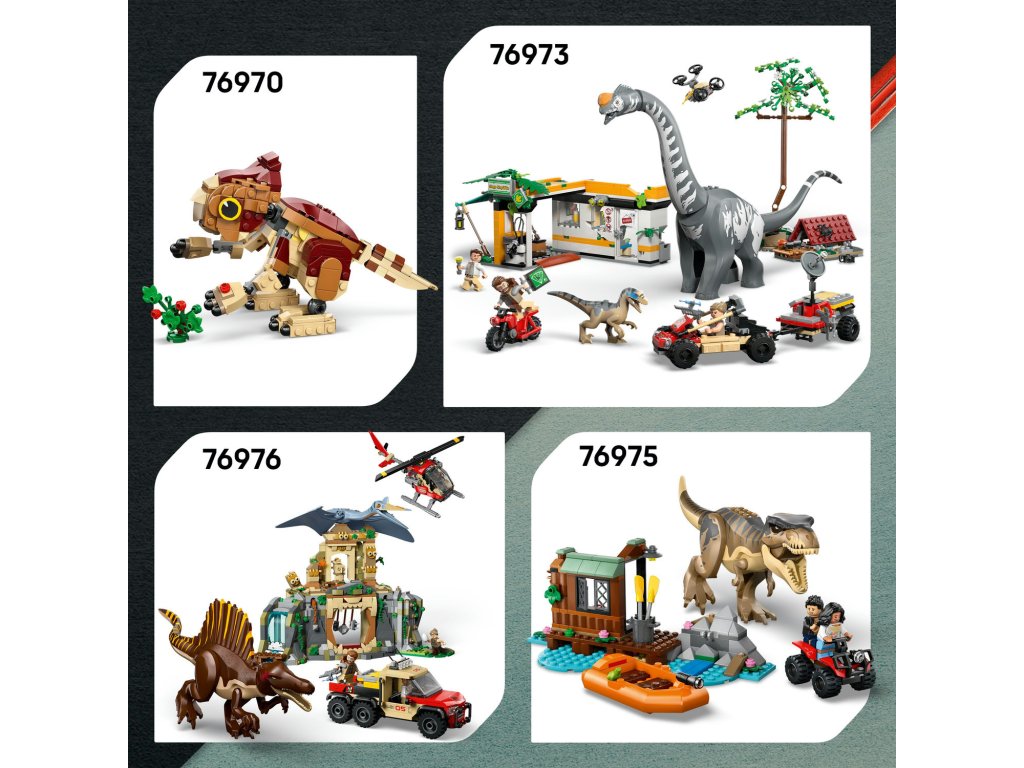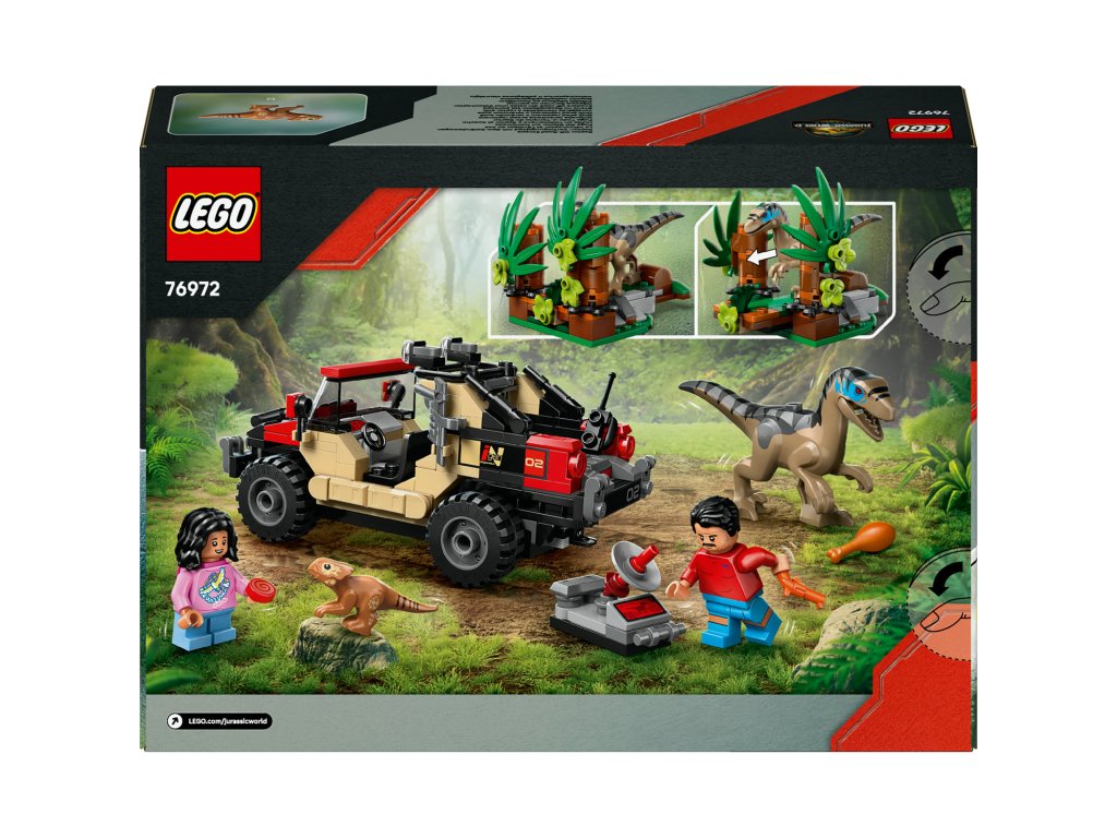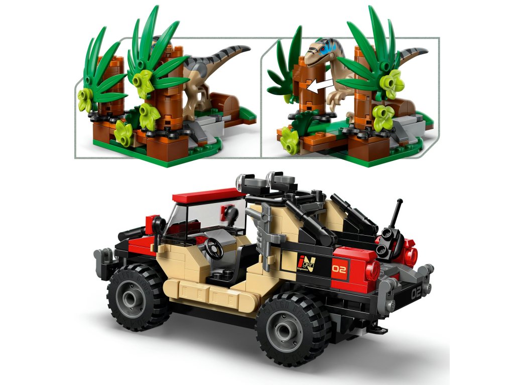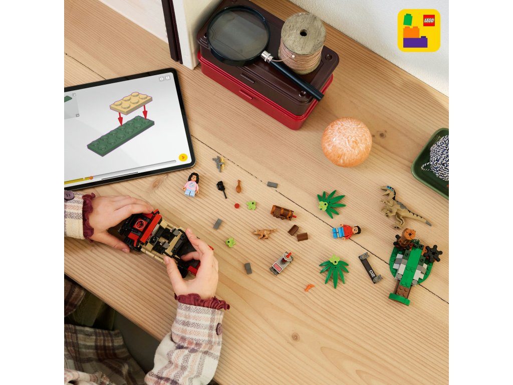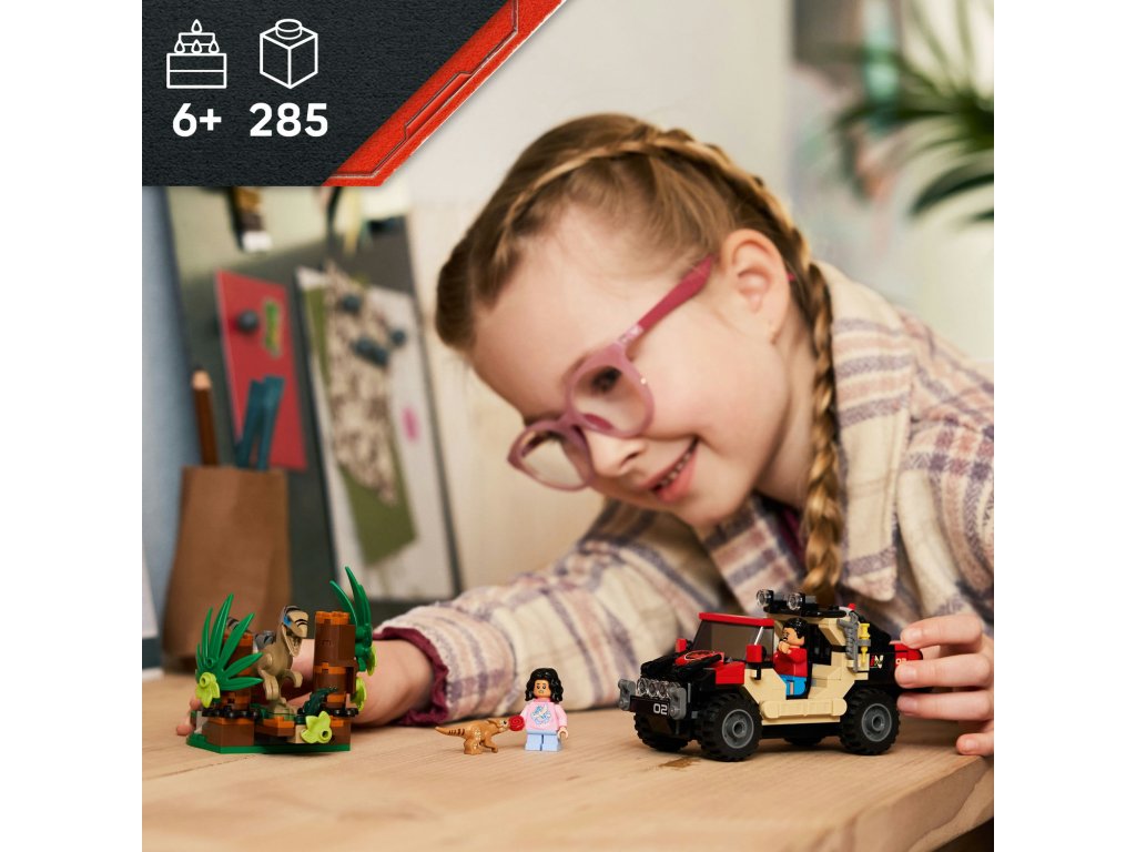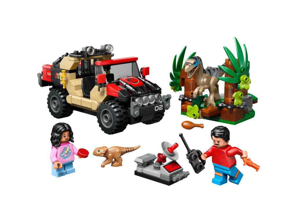 Kreativní stavebnice – Stavebnice obsahuje tvarované figurky LEGO® dinosaurů, mládě aquilopse a velociraptora, a navíc terénní vozidlo a minifigurku Reubena a Isabelly, které inspirují děti k hraní na lov dinosaurů