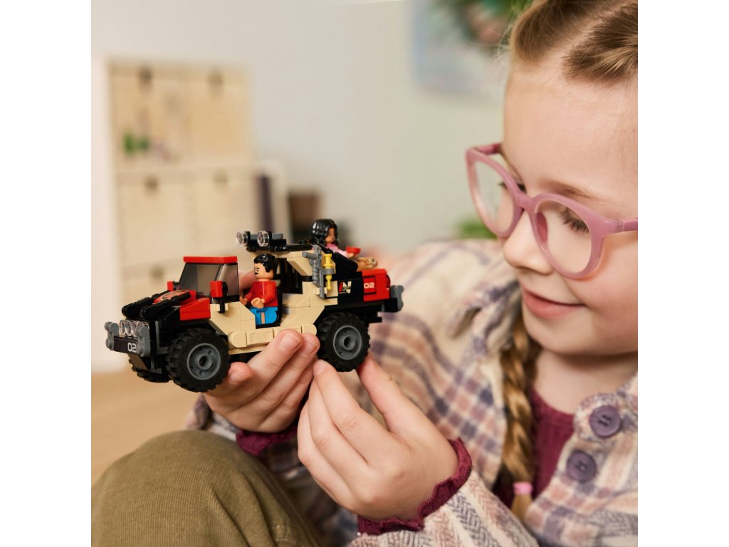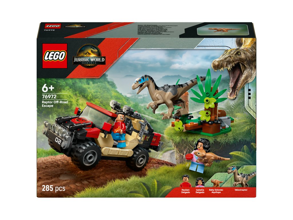 Stavebnice LEGO® Jurassic World (76972) Únik před raptorem v terénním autě je inspirovaná filmem Jurassic World: Rebirth a poslouží jako skvělý dárek pro kluky a holky od 6 let, kteří milují tyto pravěké tvory. Až děti stavebnici poskládají, připomenou si své oblíbené filmové scény nebo vymyslí nové příběhy s minifigurkami Reubena a Isabelly Delgadových, figurkou mláděte dinosaura Dolores a figurkou velociraptora s pohyblivou čelistí. Stavebnice obsahuje terénní auto a sledovací zařízení, keř se efektem „překvapení“, který můžete použít během hry s velociraptorem, a spoustu dalšího.