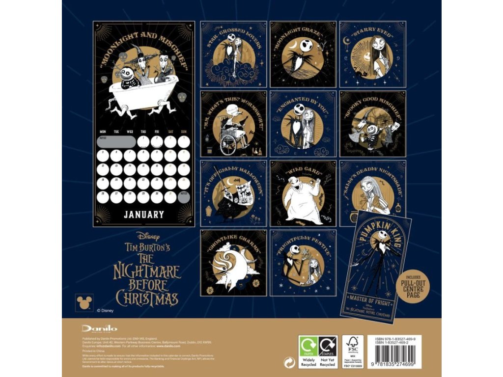 1. Dvanáctiměsíční nástěnný kalendář čtvercového square formátu (30,5 x 30,5 cm) s celkem 12 grafickými obrázky postaviček z populárního animovaného filmu Tima Burtona.