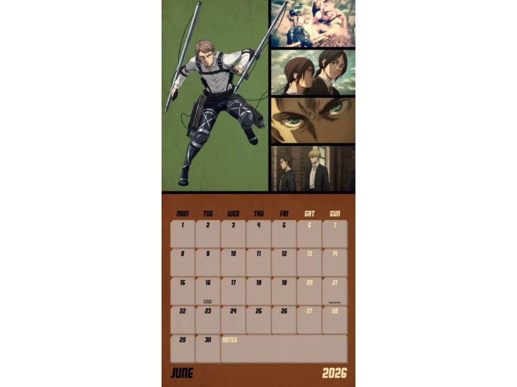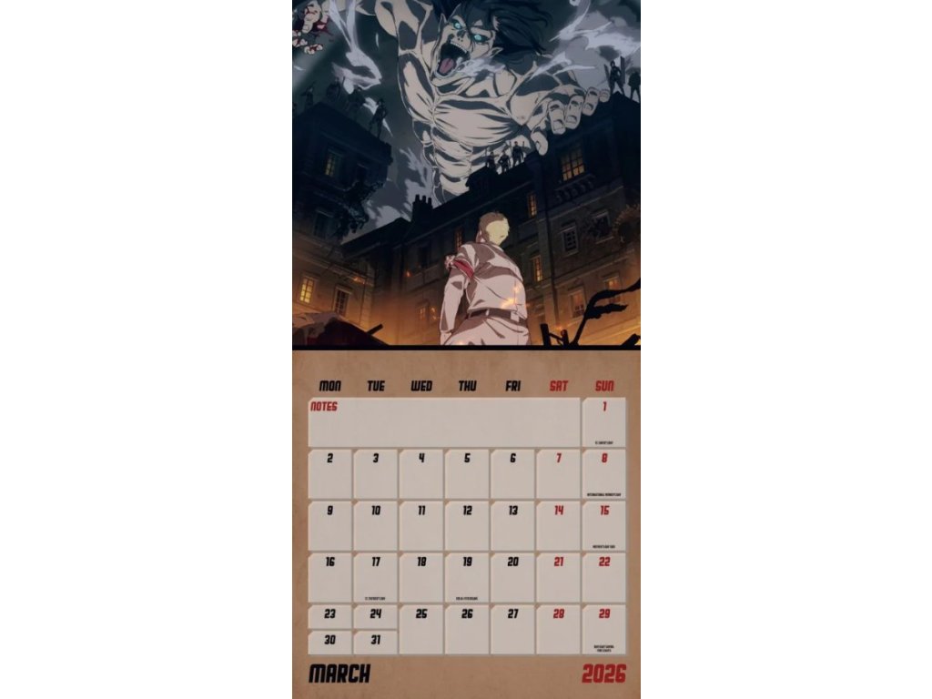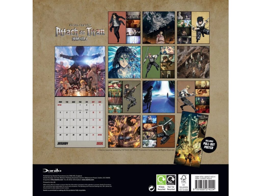 Oficiální produkt - nástěnný dvanáctiměsíční kalendář anime - manga licence Attack on Titan na rok 2026.