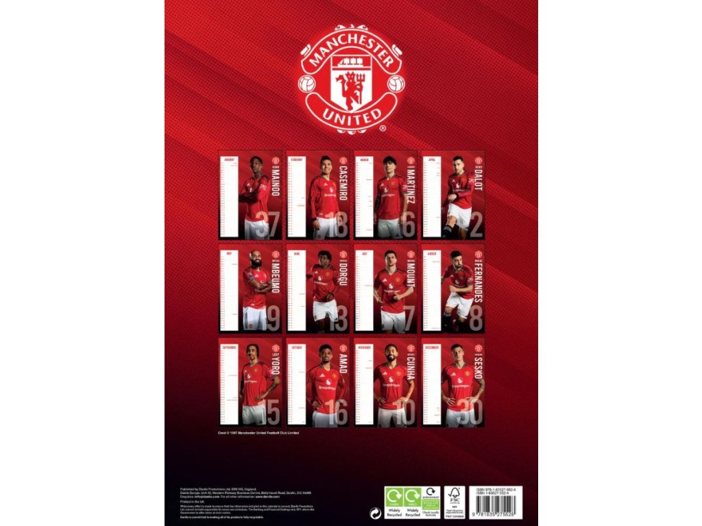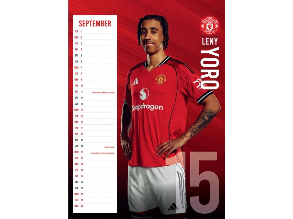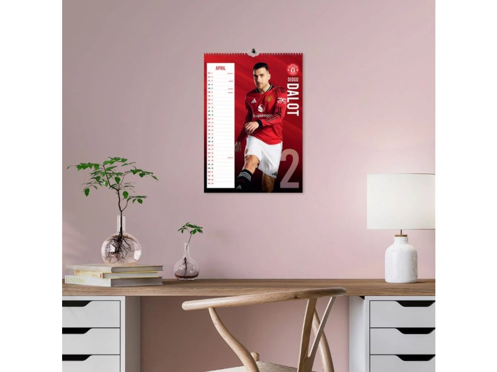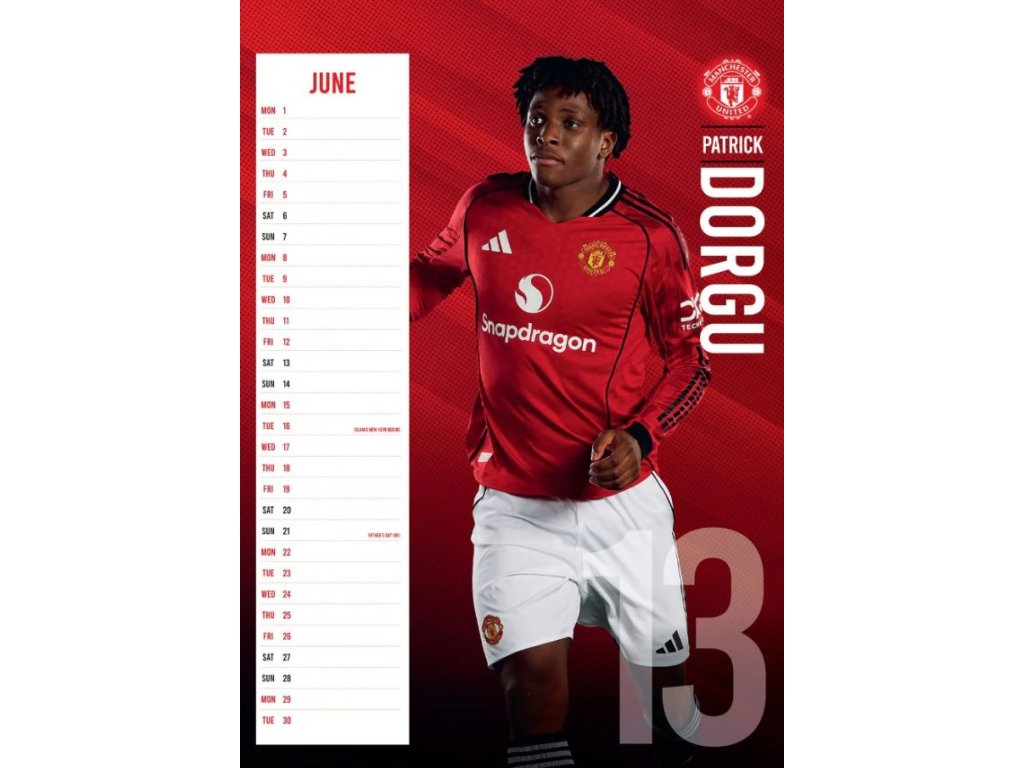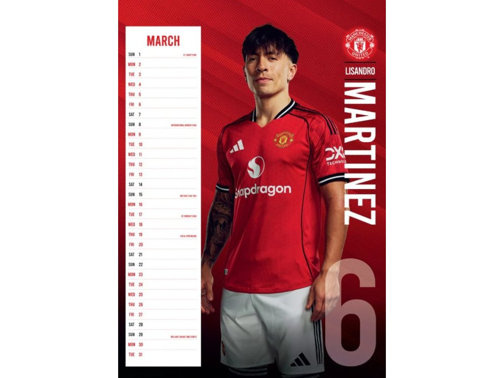 Oficiální produkt - dvanáctiměsíční nástěnný kalendář na rok 2026 s licencí britského fotbalového klubu FC Manchester United.