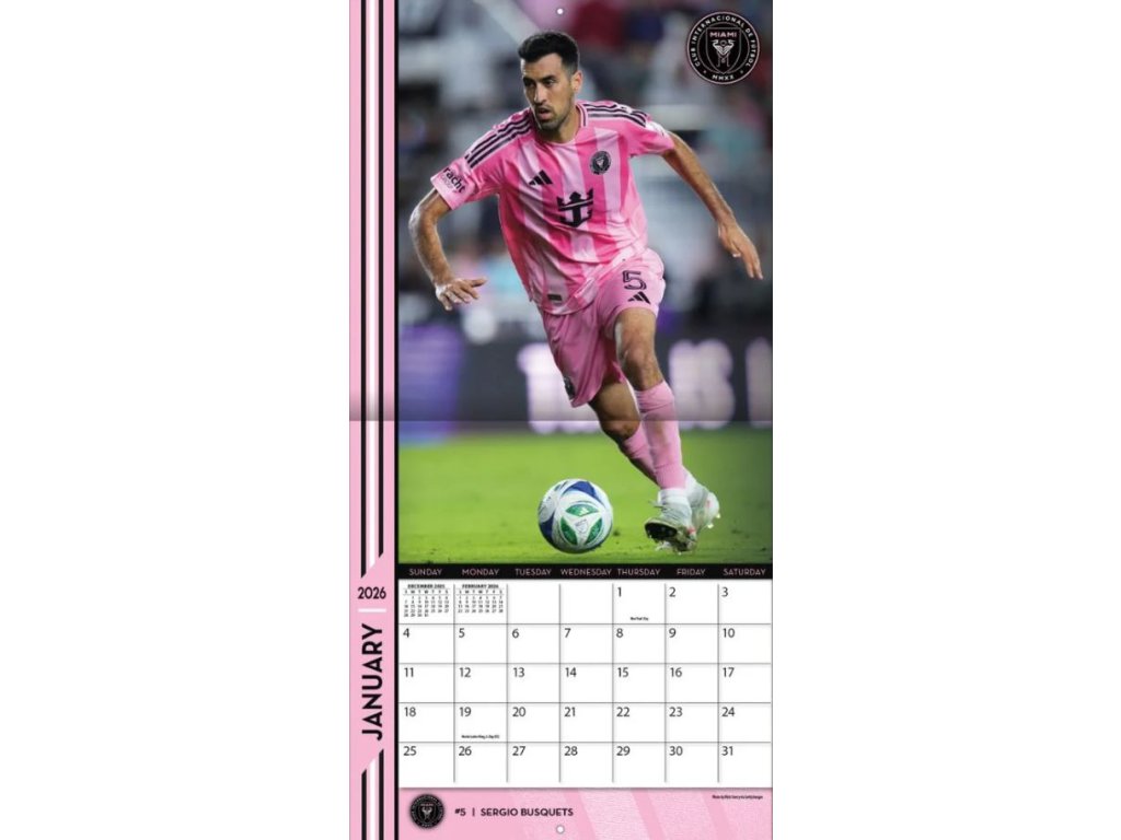 Nástěnný kalendář čtvercového square formátu (30,5 x 30,5 cm), s celkem 13 obrázky fotbalistů z týmu Inter Miami CF.