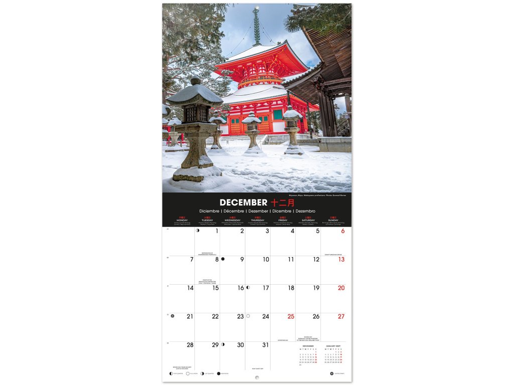 Dvanáctiměsíční nástěnný kalendář čtvercového square formátu (30 x 30 cm) s celkem 13 fotografiemi Japonska.