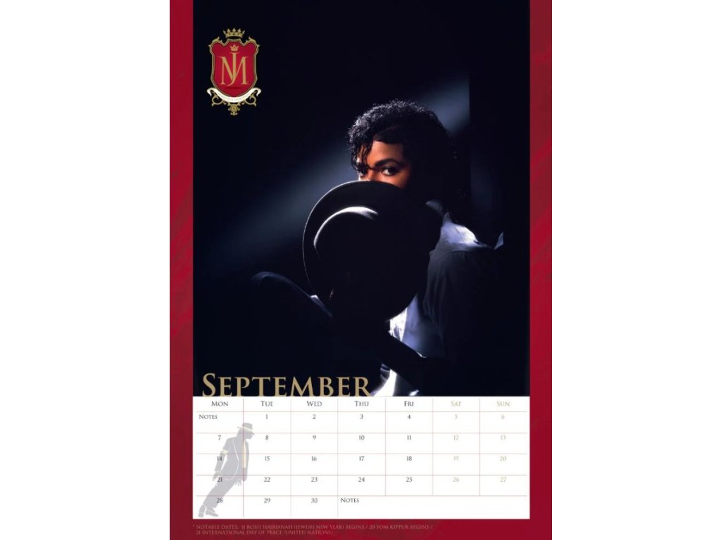 Dvanáctiměsíční nástěnný kalendář A3 formátu (29,7 x 42 cm) s celkem 13 oficiálními autorizovanými fotografiemi Michaela Jacksona.