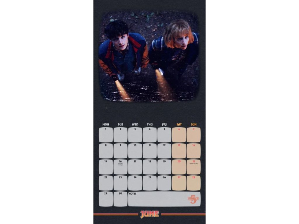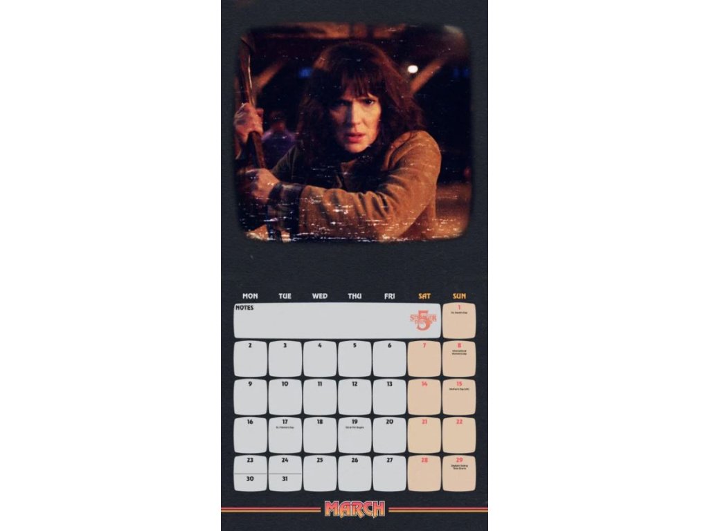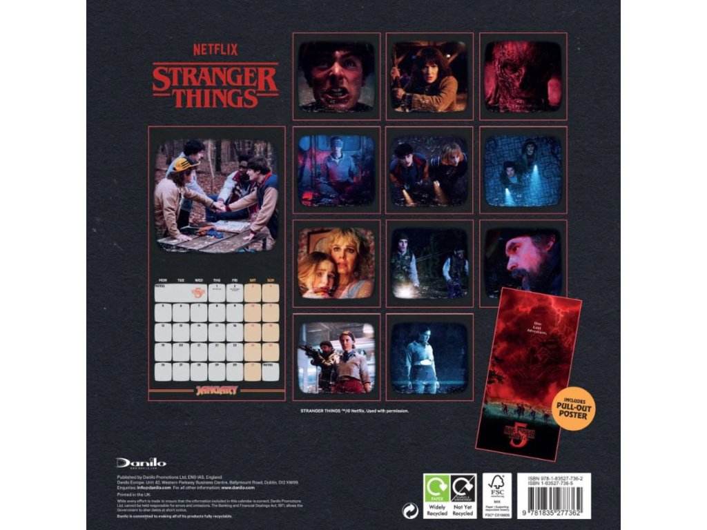 Dvanáctiměsíční nástěnný kalendář čtvercového square formátu (30,5 x 30,5 cm) s fotografiemi a grafikou postav ze seriálu Stranger Things.
