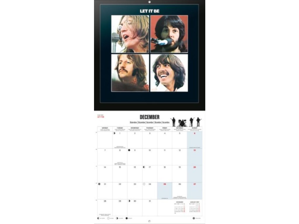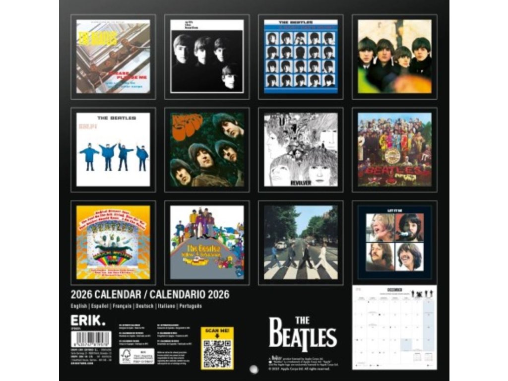 Oficiální nástěnný kalendář na 12 měsíců roku 2026 s licencí britské hudební skupiny The Beatles.