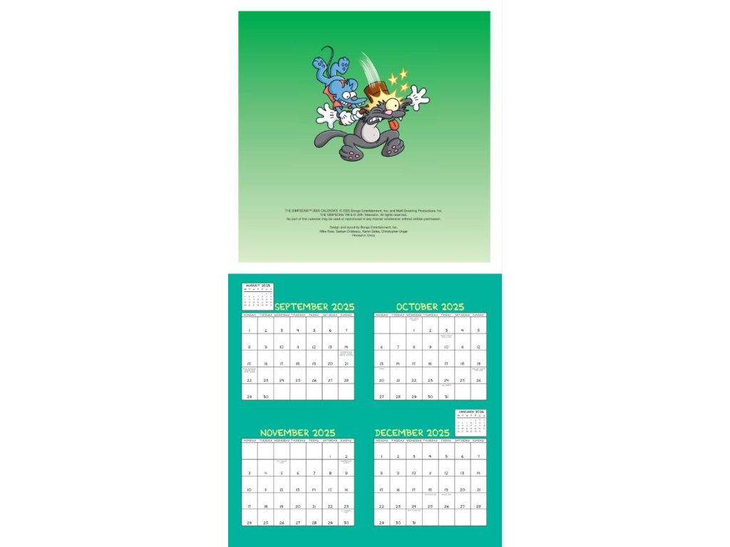 Dvanáctiměsíční nástěnný kalendář čtvercového square formátu (30,5 x 30,5 cm) s celkem 13 kreslenými obrázky rodinky Simpsonových a dalších seriálových postav.