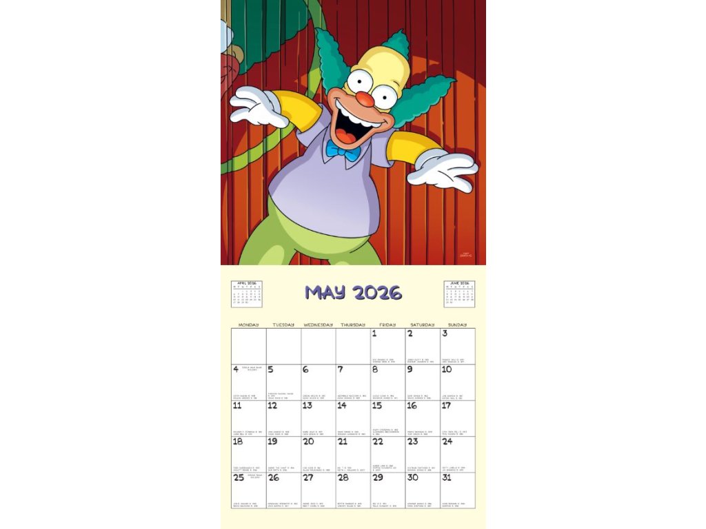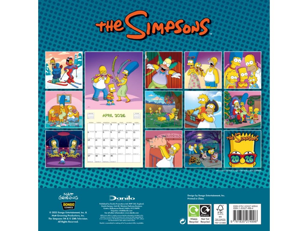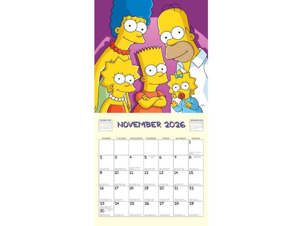 Oficiální produkt - dvanáctiměsíční nástěnný kalendář na rok 2026 s licencí seriálu The Simpsons (Simpsonovi).
