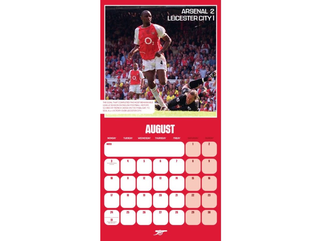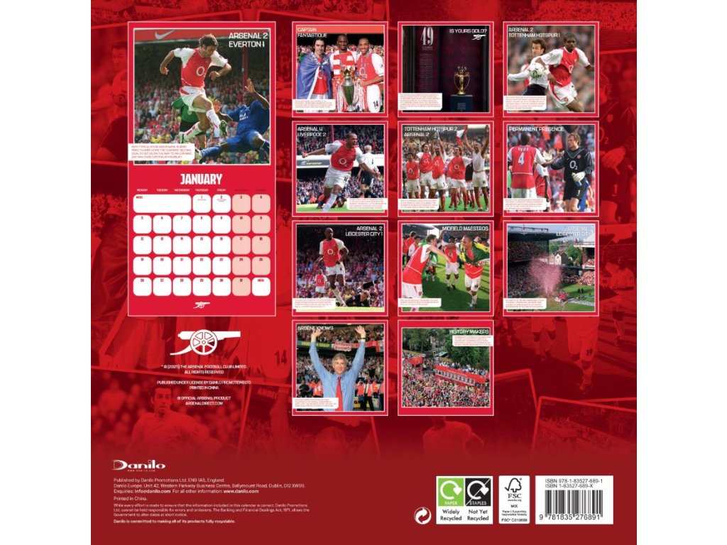 Dvanáctiměsíční nástěnný kalendář square formátu (30,5 x 30,5/61 cm) s celkem 12 oficiálními fotografiemi legendárních hráčů a momentek zápasů a událostí, které se nesmazatelně zapsali do historie slavného britského klubu FC Arsenal.