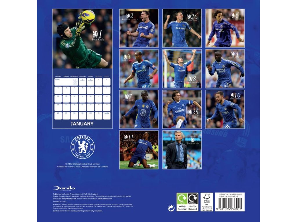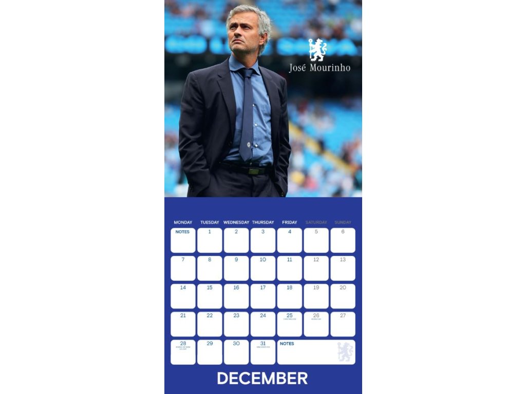 Dvanáctiměsíční nástěnný kalendář square formátu (30,5 x 30,5/61 cm) s celkem 12 oficiálními fotografiemi legendárních hráčů a momentek zápasů, které se nesmazatelně zapsali do historie slavného britského klubu FC Chelsea.