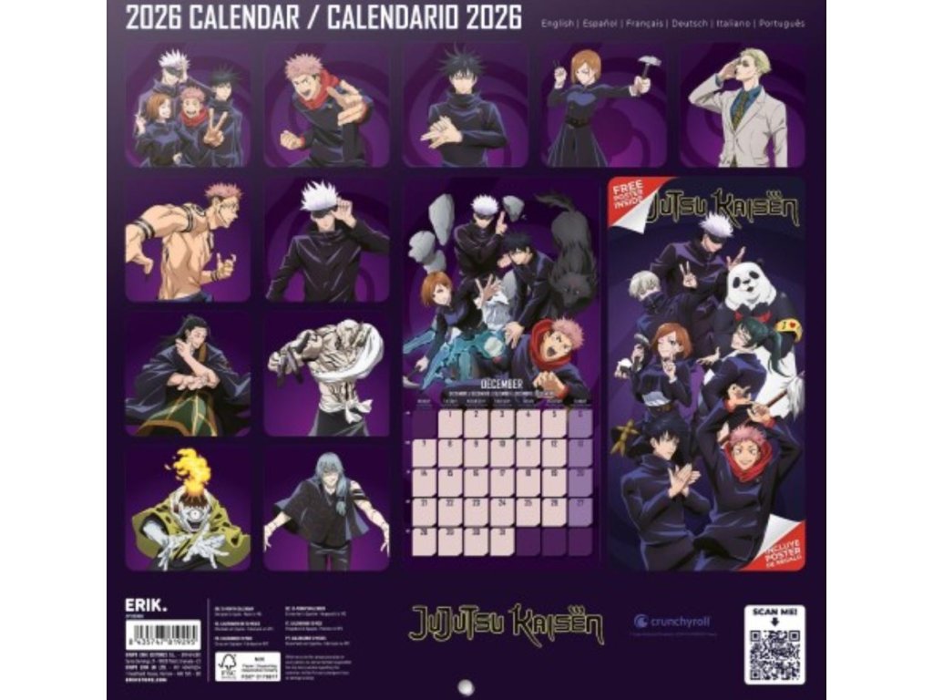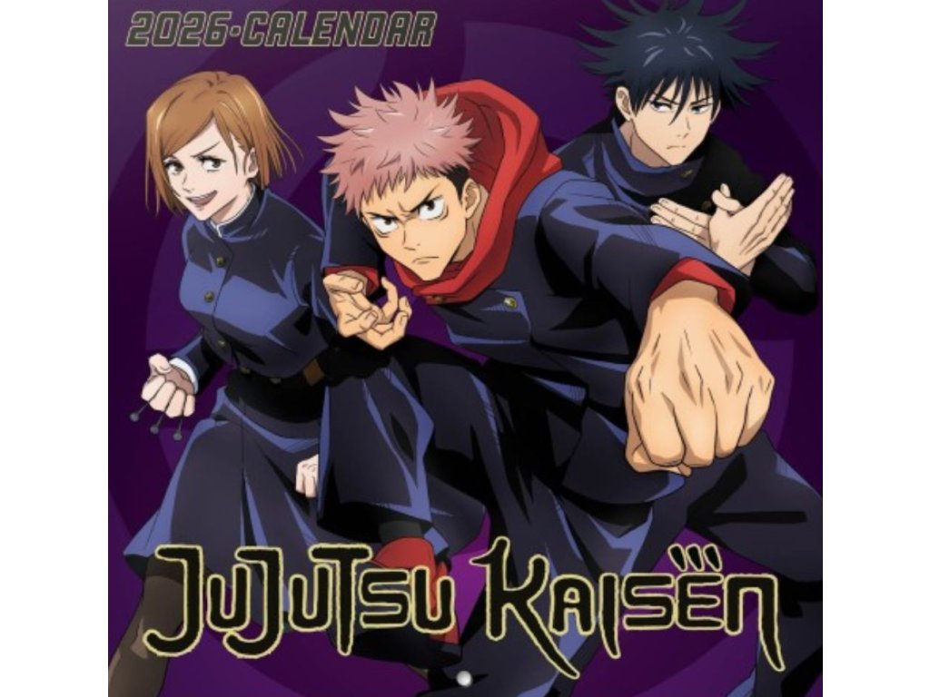 Oficiální nástěnný kalendář z katalogu produktů s licencí japonského mangy Jujutsu Kaisen na rok 2026.