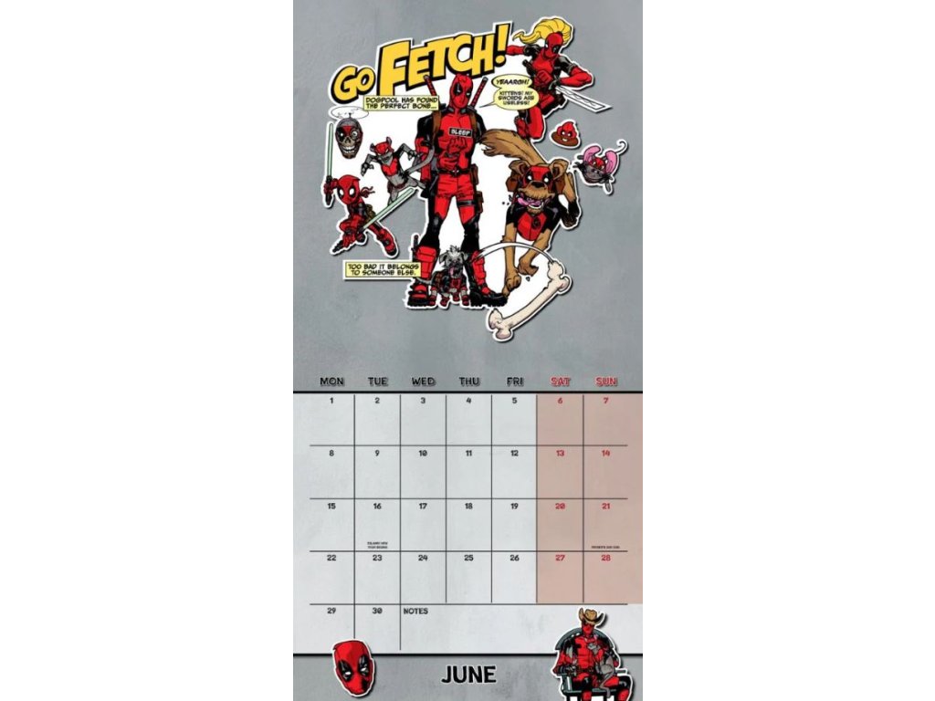 Oficiální dvanáctiměsíční nástěnný kalendář studia Marvel na rok 2026 s komiksovou licencí Deadpool od společnosti Marvel.