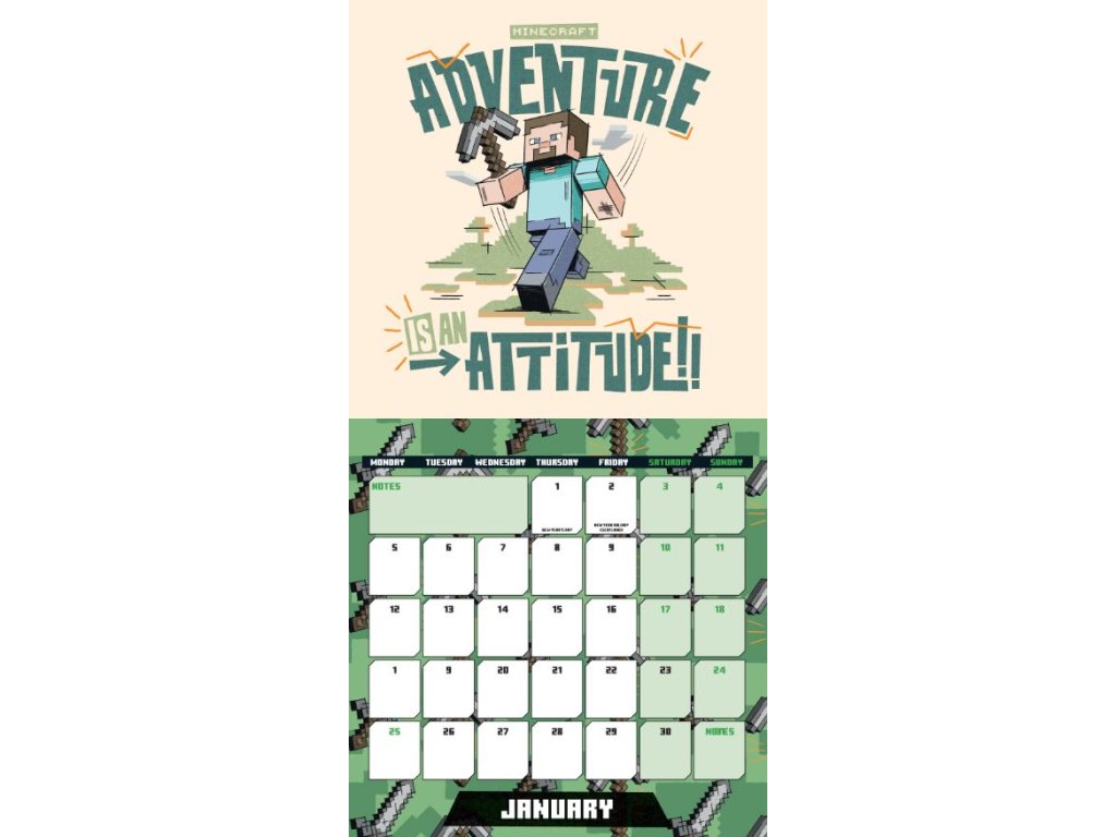 Dvanáctiměsíční nástěnný kalendář čtvercového square formátu (30,5 x 30,5 cm) s celkem 13 grafickými obrázky s motivy počítačové hry MInecraft.
