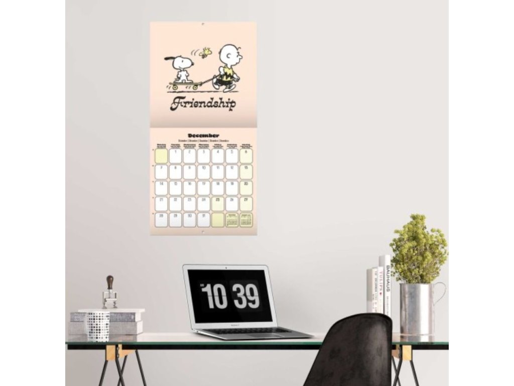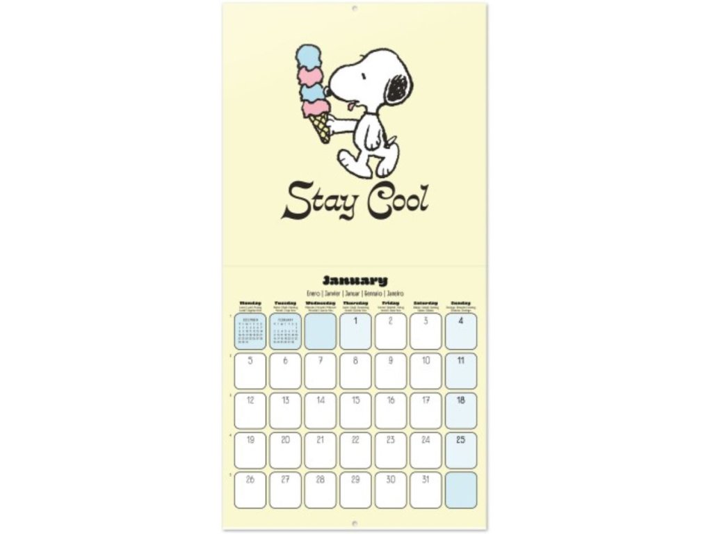 Dvanáctiměsíční nástěnný kalendář čtvercového square formátu (30 x 30 cm) s celkem 12 obrázky legendární postavičky Snoopy.