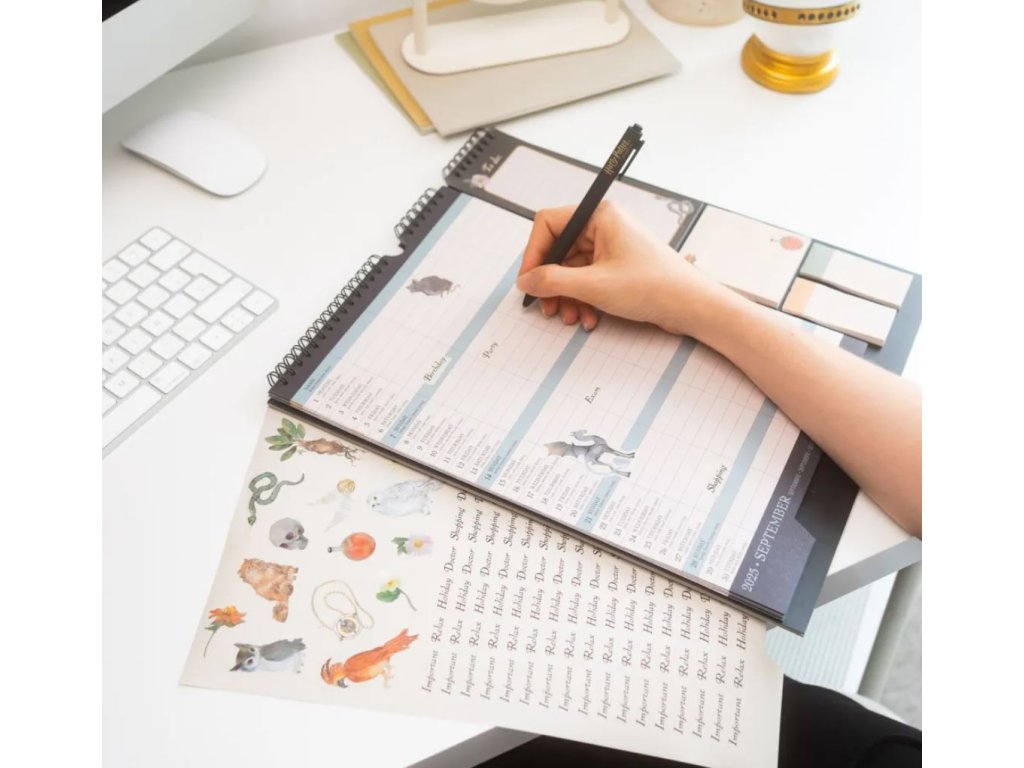 Plánovač obsahuje plánovací kalendář, blok na nákupní seznam, samolepicí blok 7 x 7,5 cm, 2 samolepící bloky 3,2 x 6,8 cm, 1 list poznámkových samolepek a propisku. Drátěná vazba s ramínkem na pověšení.
