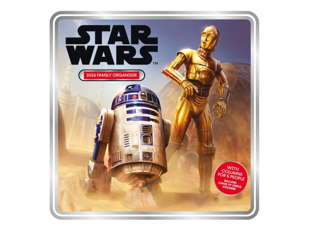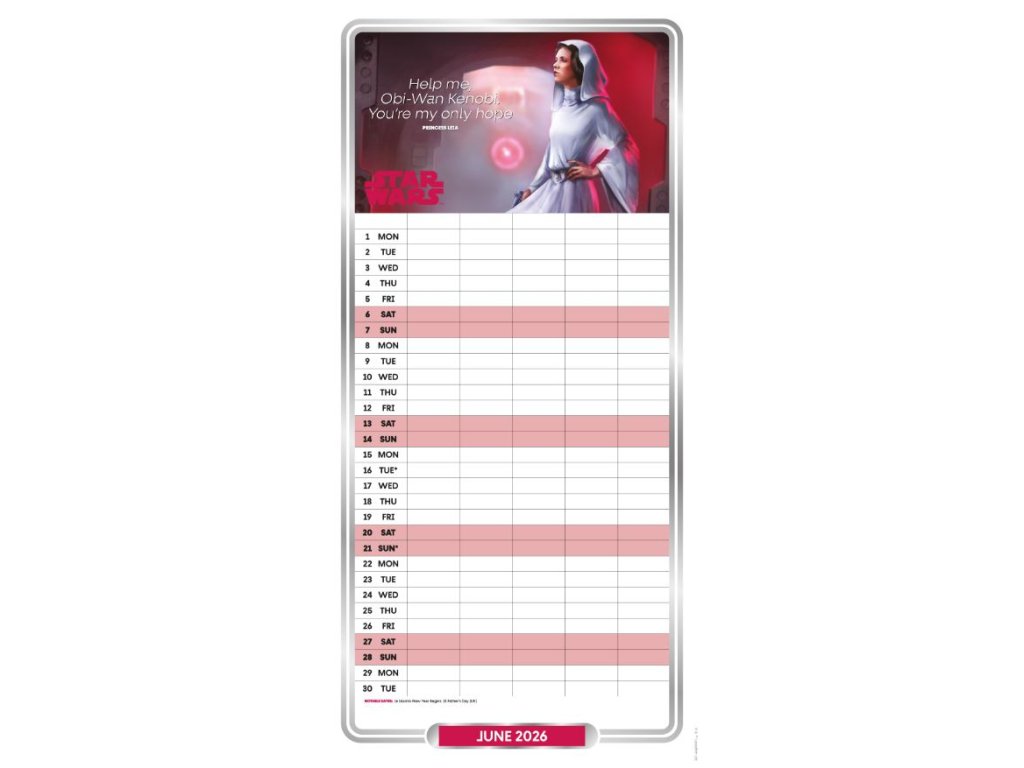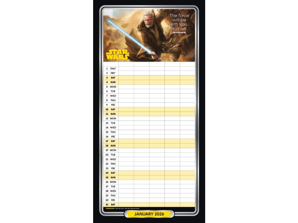 Oficiální produkt - dvanáctiměsíční nástěnný plánovací kalendář a organizér na rok 2026 s licencí a grafikou filmové ságy Star Wars.