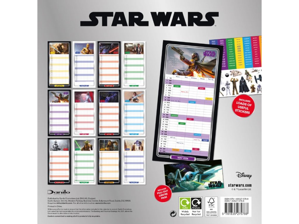 Dvanáctiměsíční nástěnný plánovací kalendář čtvercového square formátu (30,5 x 30,5 cm) s celkem 12 měsíčními listy, vyvedenými s kreslenou grafikou postav Star Wars.