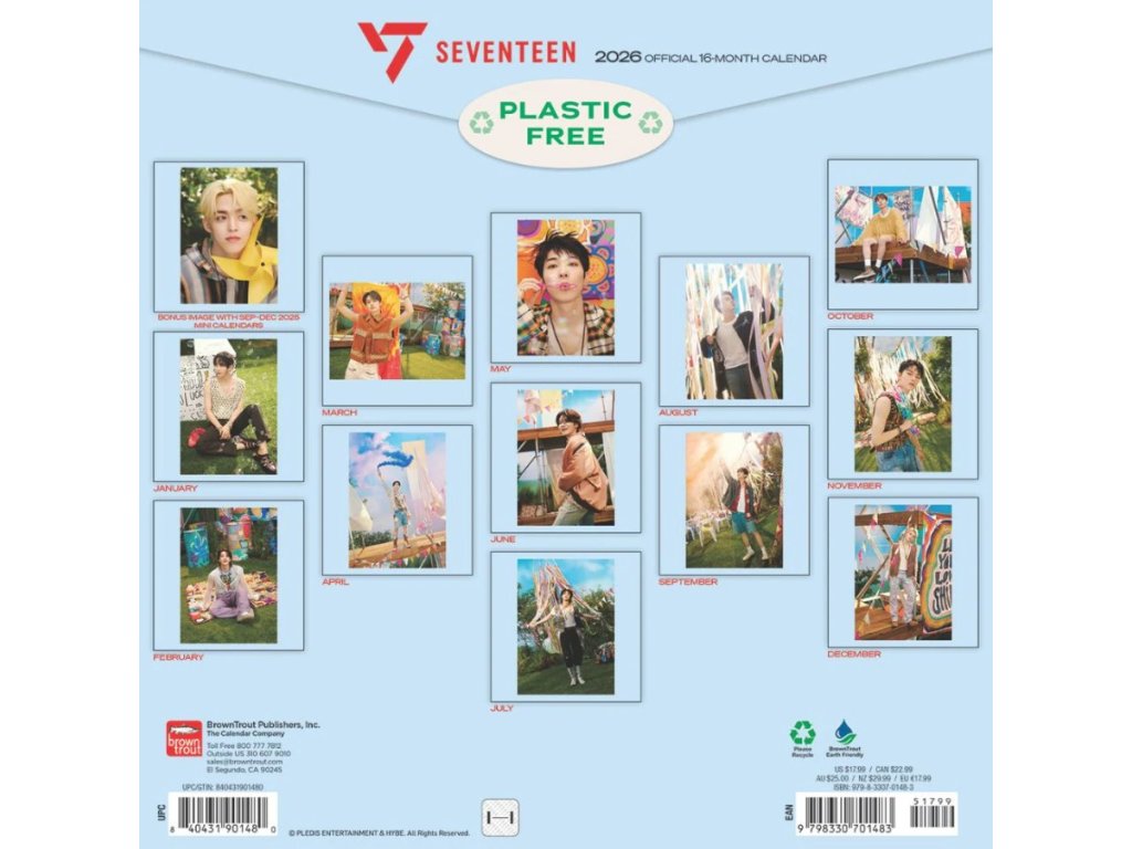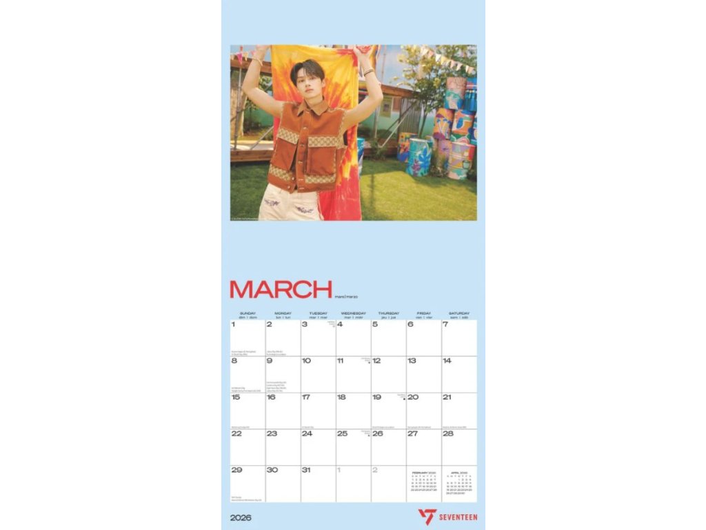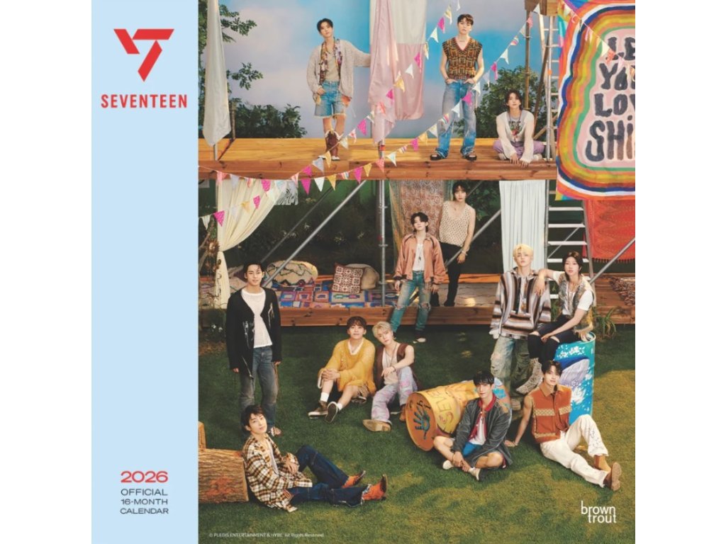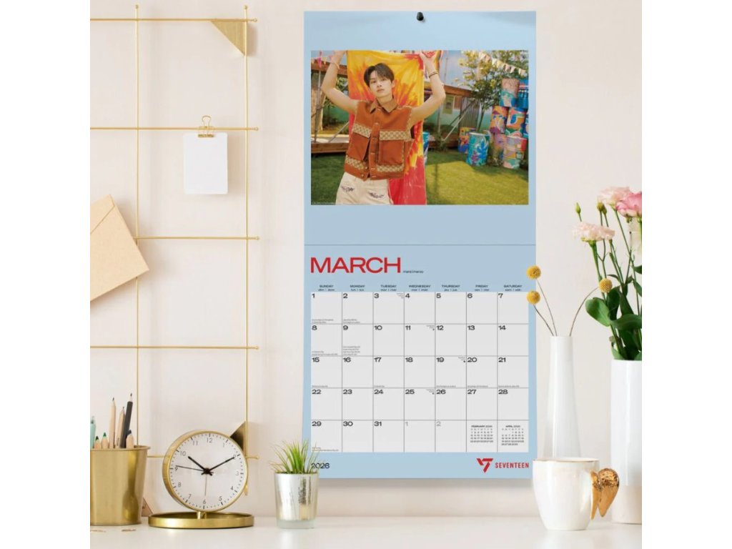 Oficiální produkt - dvanáctiměsíční nástěnný kalendář na rok 2026 s licencí jihokorejské hudební skupiny Seventeen.