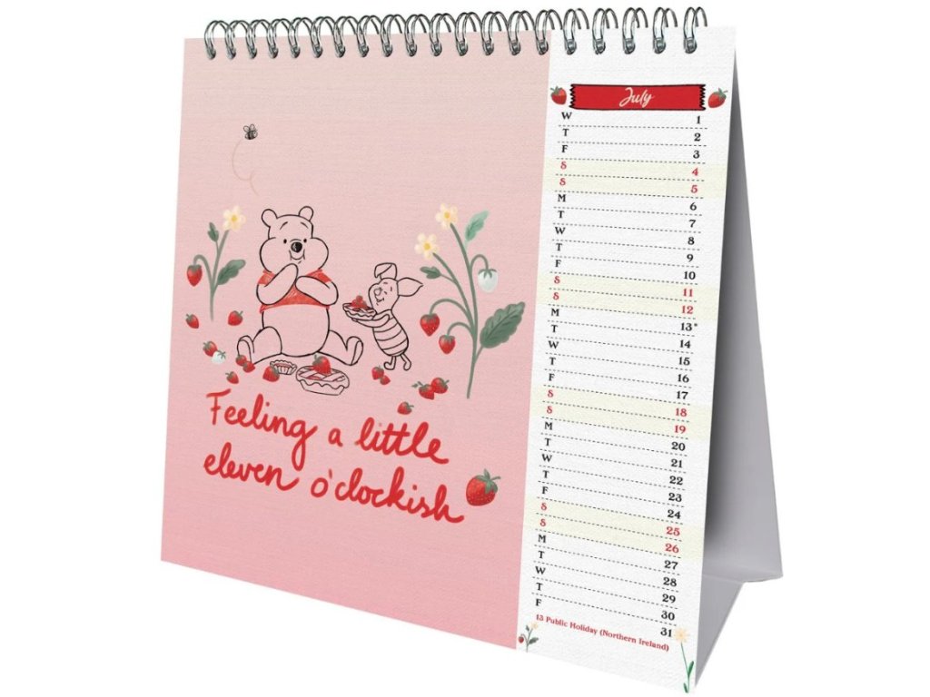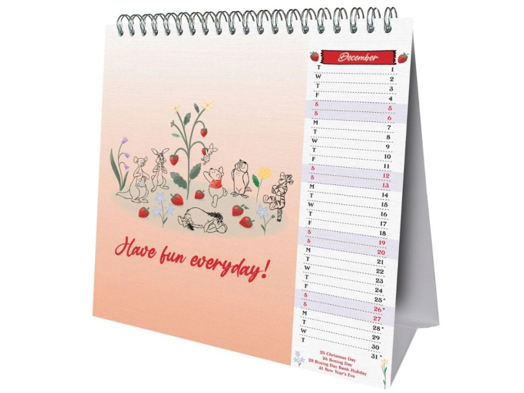 Dvanáctiměsíční otáčecí stolní kalendář v kroužkové vazbě s měsíčními listy a kreslenými obrázky Medvídka Pú a kamarádů. Stránka každého měsíce má perforovaný okraj, takže ji lze snadno odstranit a vytvořit z ní pohlednici, kterou si můžete ponechat nebo poslat příteli.