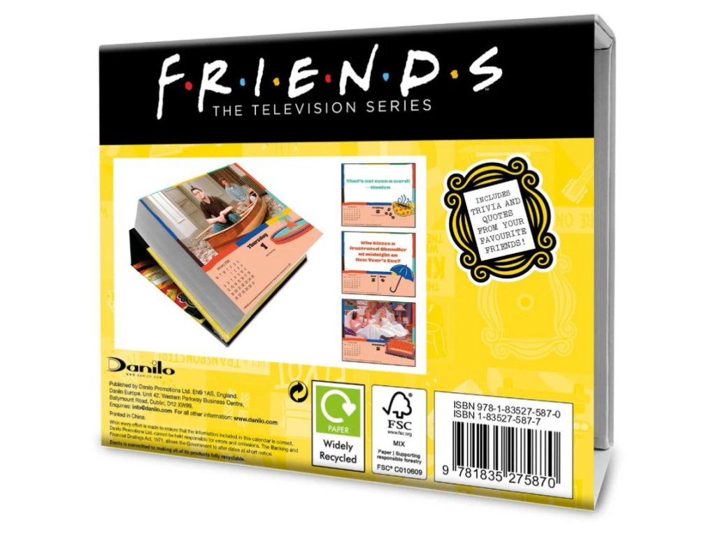 Stolní trhací kalendář formátu s celkem 365 obrázky a fotografiemi populárního komediálního televizního seriálu Friends (Přátelé). Začínat každý den s úplně novým obrázkem ze seriálu určitě potěší nejen fanoušky kultovního sitcomu Friends. Nový den = nová výzva!